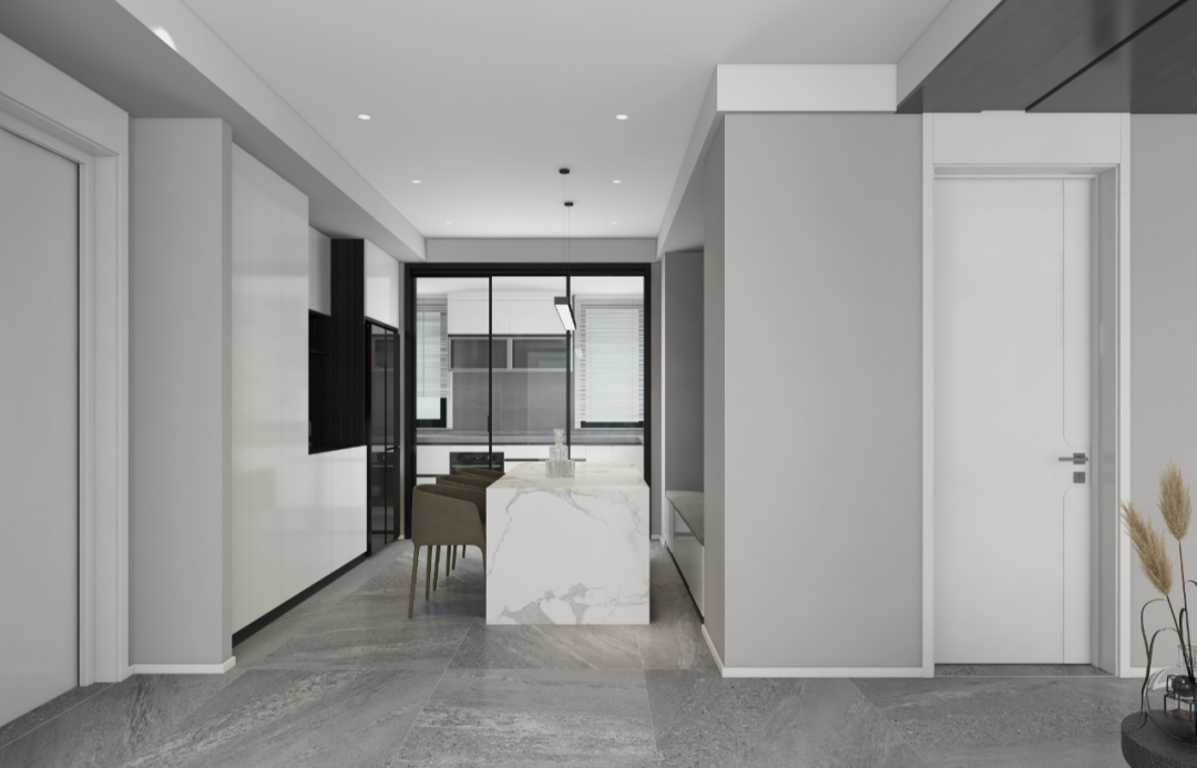 柜门与室内门选用同一材质,让室内空间更为流畅。长岛台一体设计,为亲友聚餐增加就餐空间的同时,也能化身小户型的办公区域,让一杯手冲咖啡的香气,打造格调感十足的居家办公氛围。