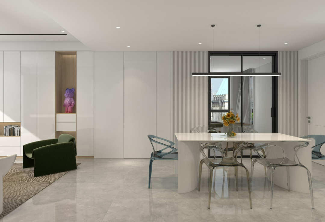 作为客厅视觉延续的开放式厨房,餐桌选择与整屋装修色调统一的白色,以亮眼的桌椅点缀空间,使整个餐厨区域与客厅区域更加协调。