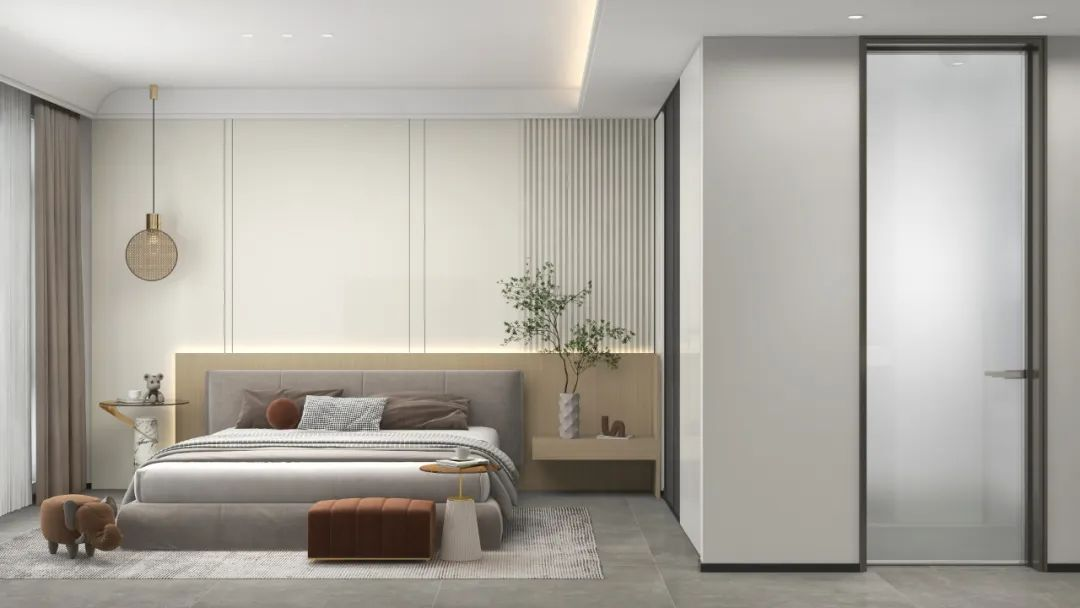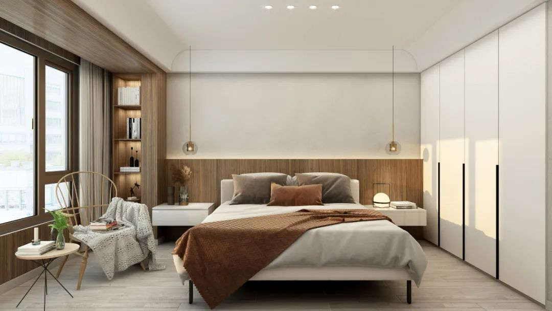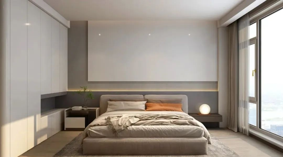 想要一夜好眠,不妨将大盏吊灯,换成内嵌式灯带,让简洁的顶面与柔和的光源,为你营造每一夜的香甜美梦。悬挂床头柜与布艺包边床,为日常打扫带来极大的便利,从此告别床底落灰的卫生烦恼。