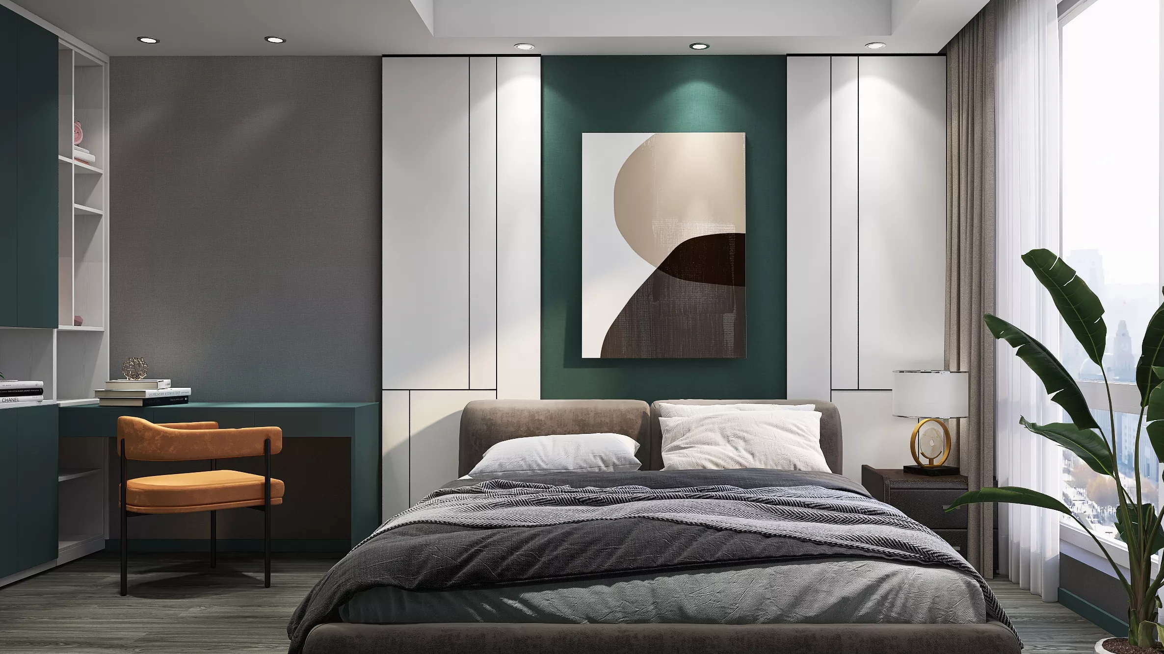 在色彩上使用了具有东方色彩韵味的黛绿色,使得空间一下幽静了起来,浓浓的东方气息充斥着整个居士空间。