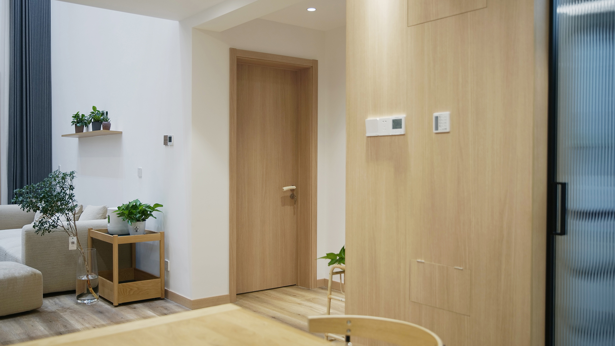 卧室门的颜色材质也选用与墙板一致的同质同色的米橡色。这样让空间看起来错落有致的同时,也会更统一。