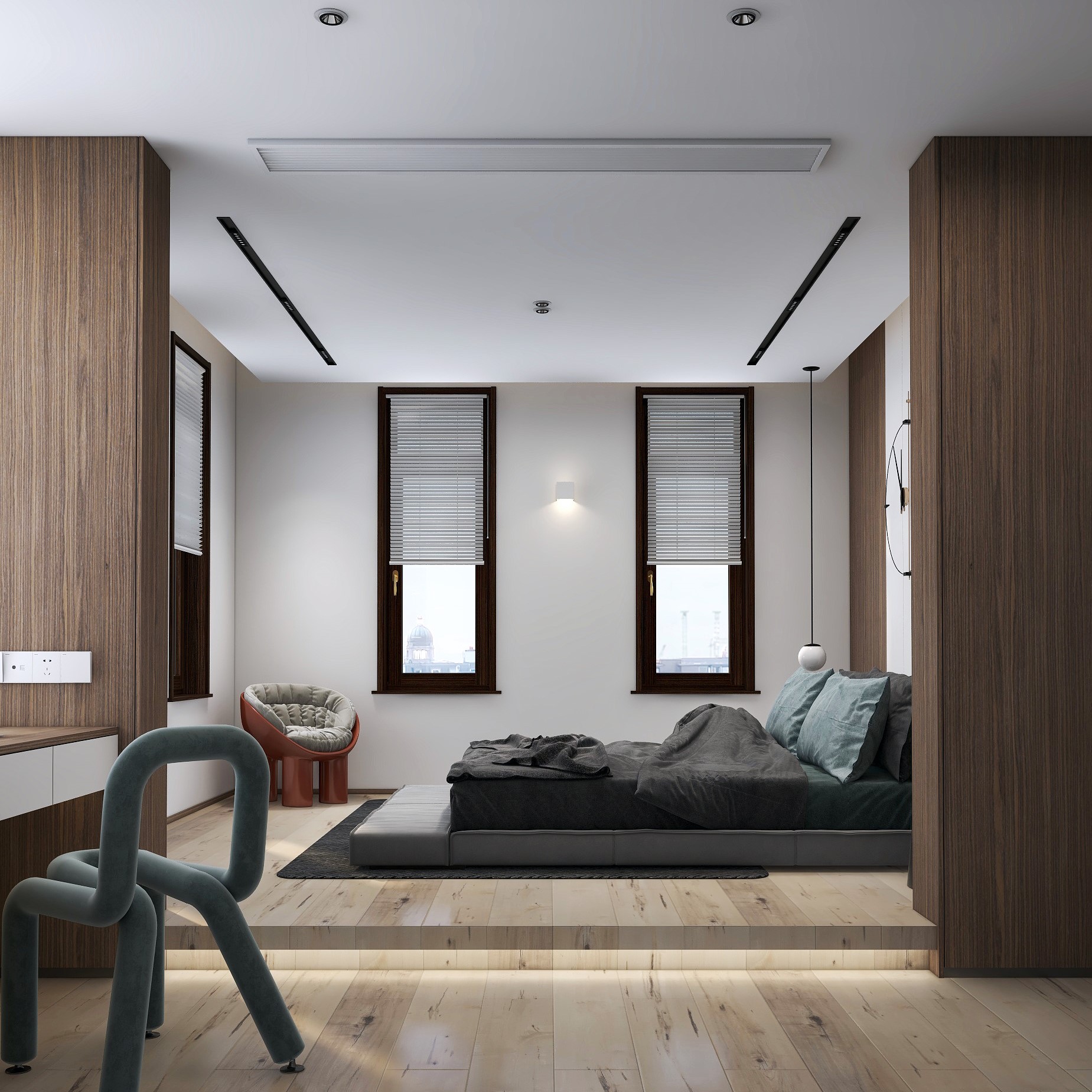 卧室的设计亮点就在背景墙,拼接的墙板搭配储物背景墙,打开侧边的墙面装饰里面可以摆放衣物与收纳。