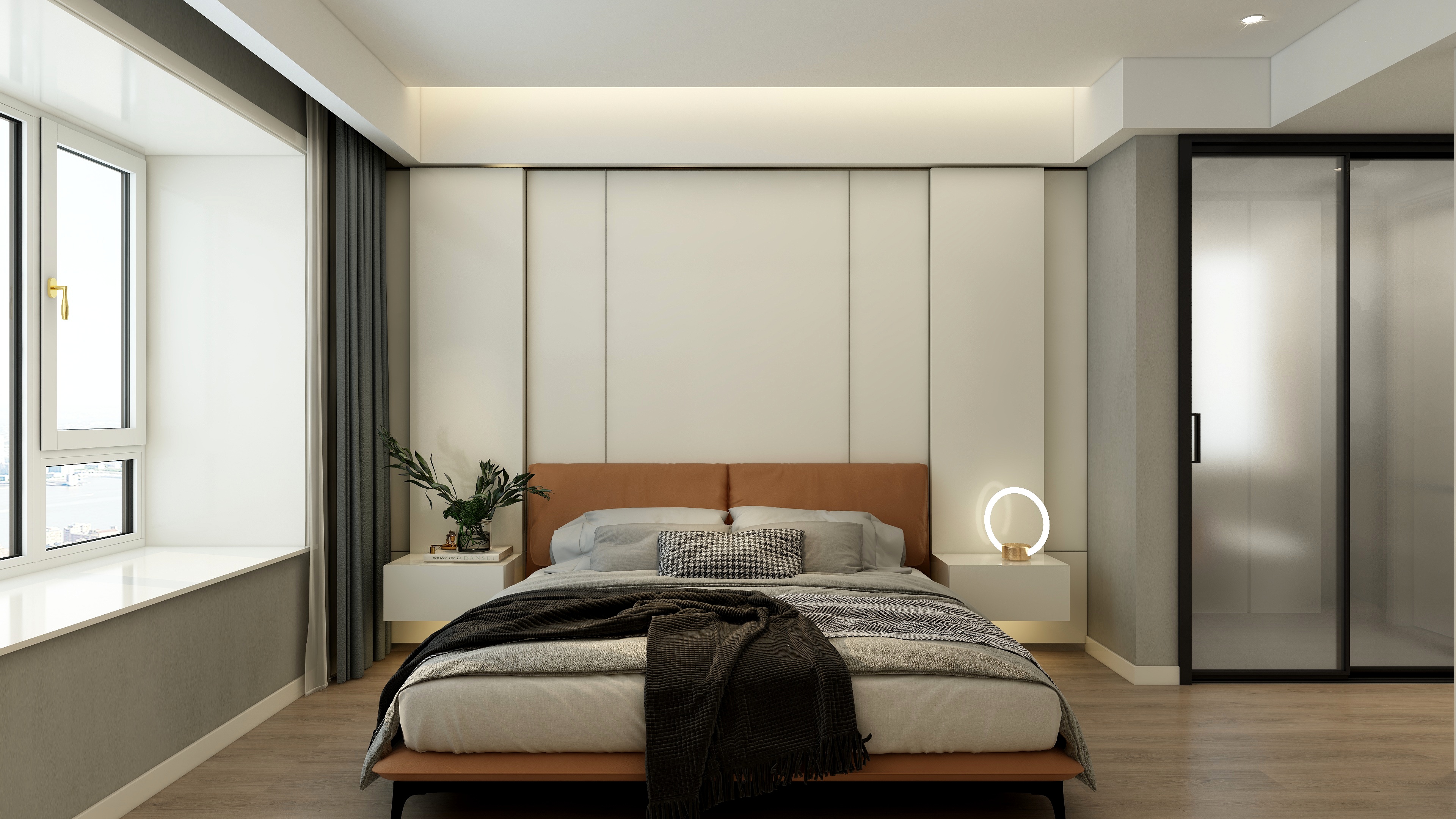整体区域增加了一个衣帽间,选用极简推拉门作为一个隔断,磨砂玻璃质感配合黑色金属,拉升了整体的设计感。同样契合了“化繁为简”的设计初衷,比起一般的推拉门,更加轻盈。窄边设计,凸显出大面积的玻璃,在视野上更加具备开阔性。居住体验不仅仅取决于风格与美感,空间的实用性更是一项重要的衡量标准。尤其是卧室,一个安静舒适的空间可以大大提升日常的休息与睡眠质量。