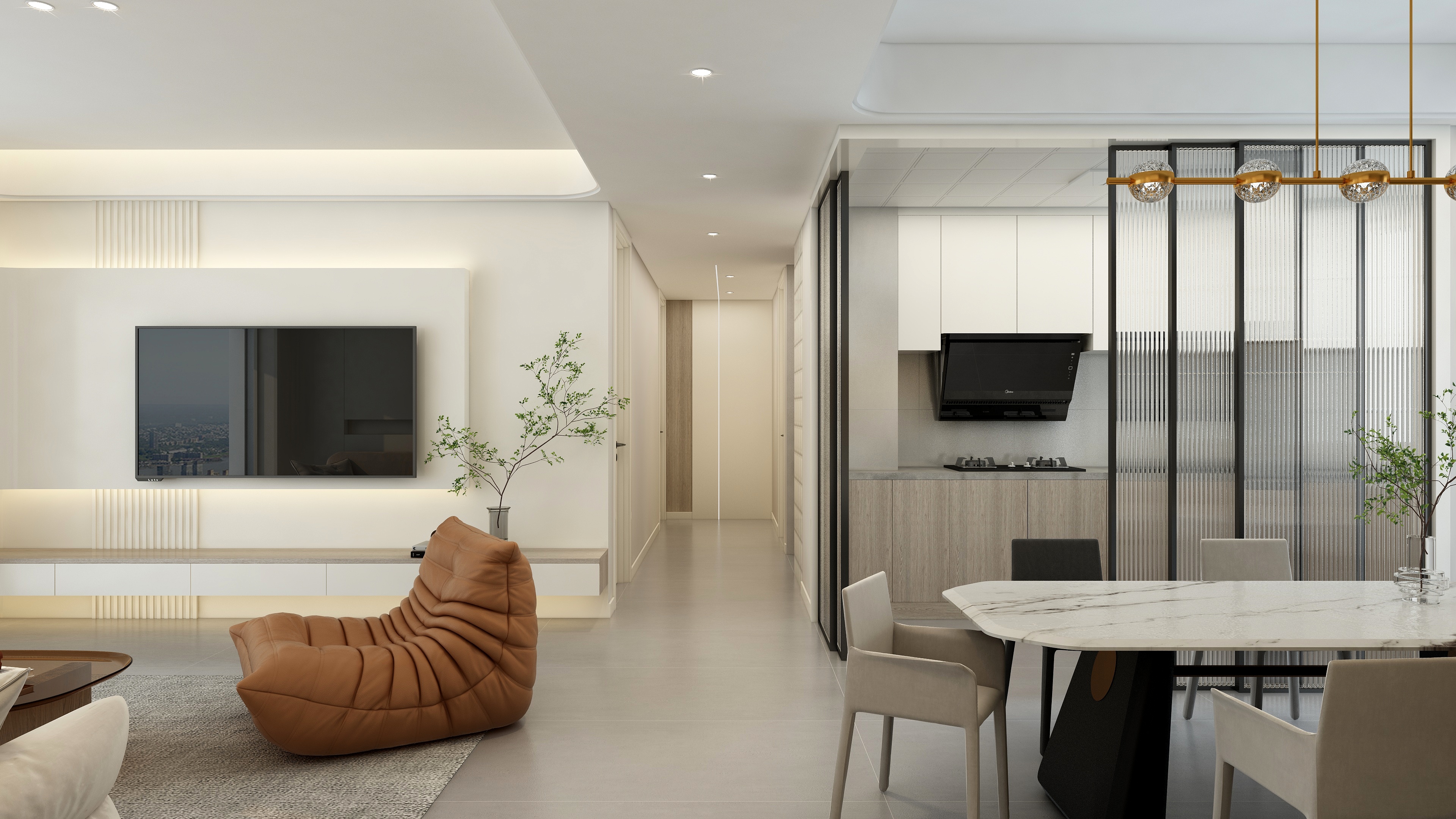客餐厅的设计主要由黑白灰三个低饱和度的色彩构成,营造用餐区简单纯粹而又温暖的氛围。色彩影响空间的结构,客厅的莫兰迪色点缀与餐厅简单的配色,彰显空间的归属,形成分二不隔的视觉体验。