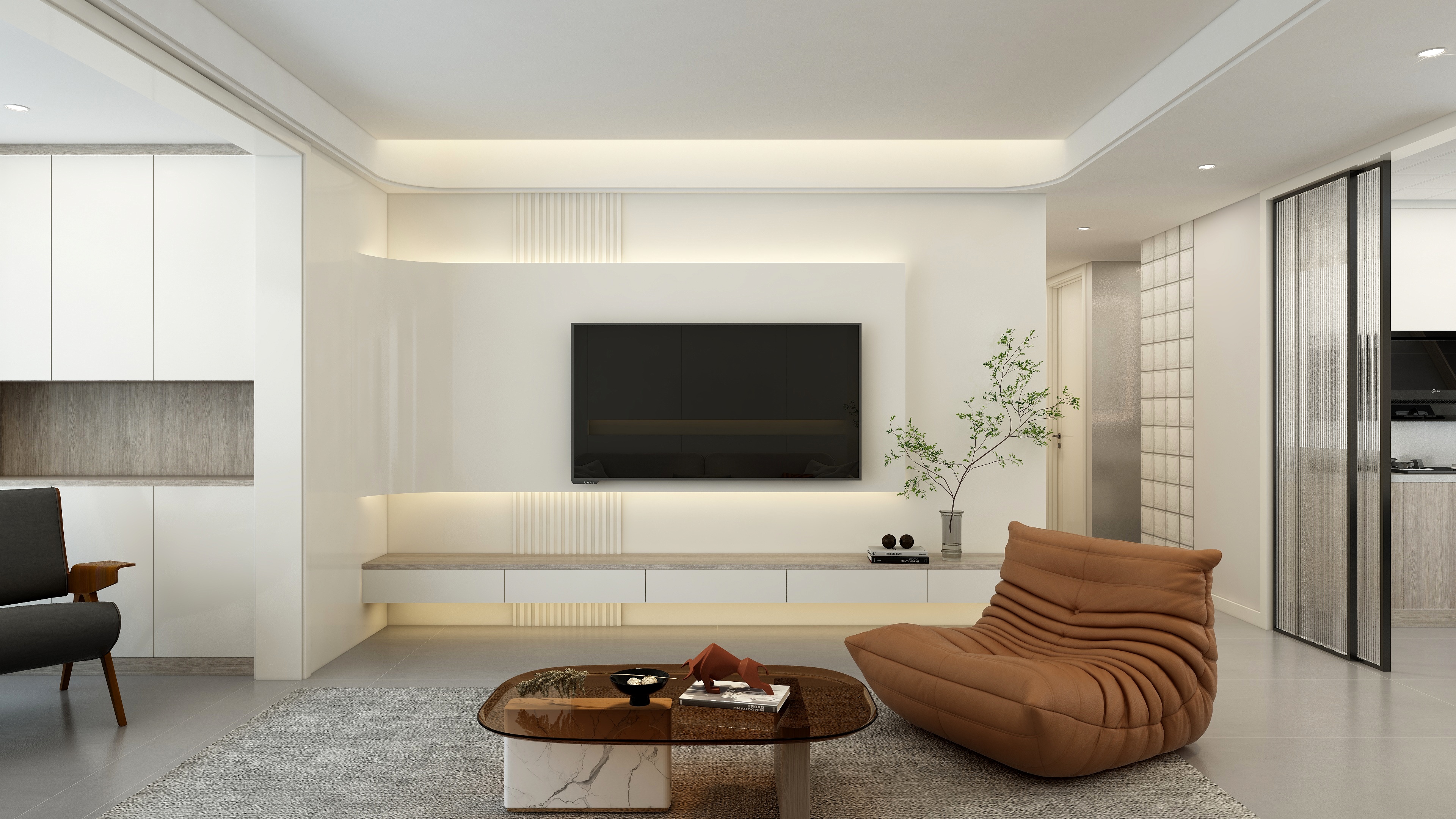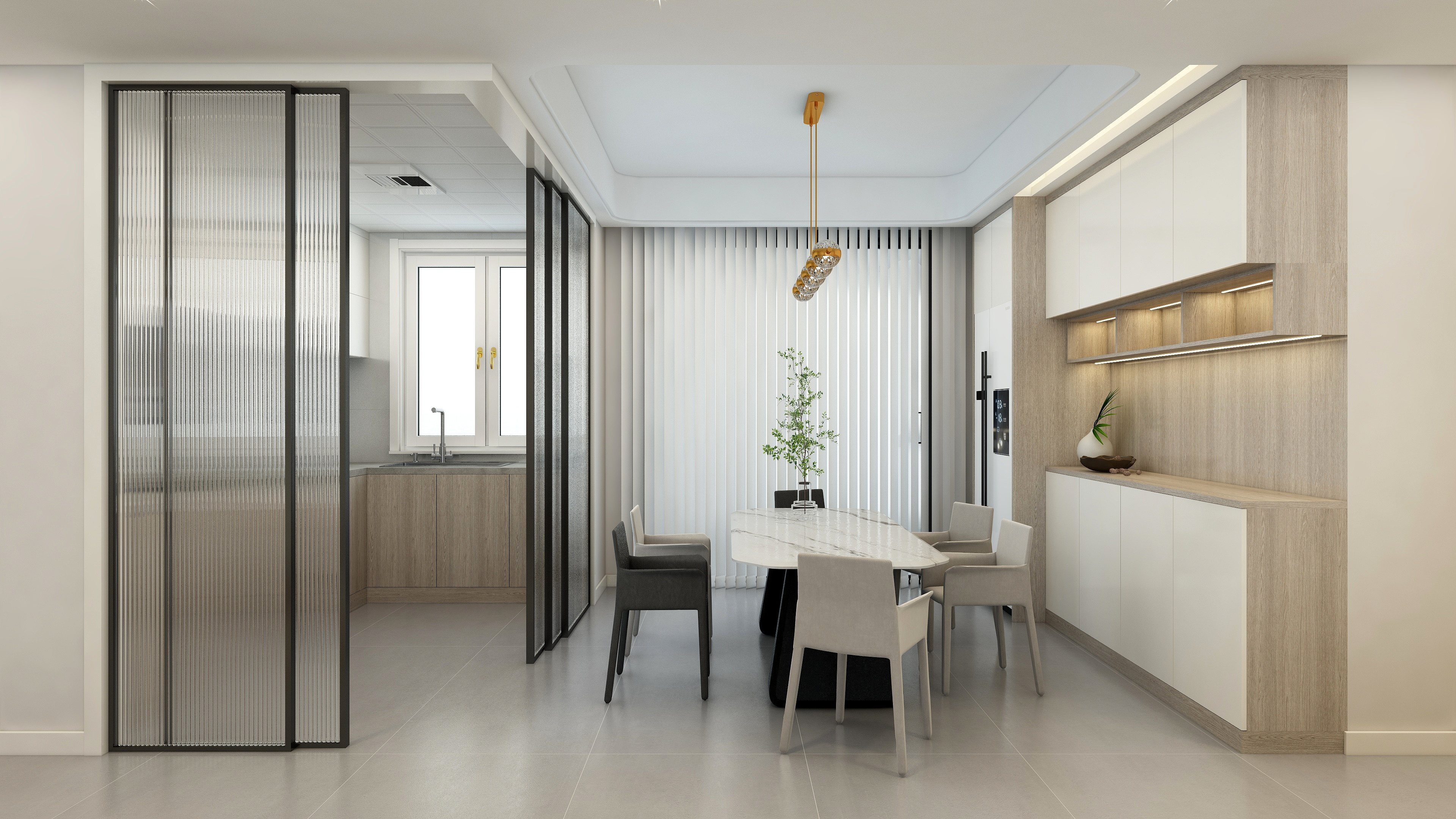 玻璃材质选用的是长虹玻璃,若隐若现的视觉体验,不仅增强了室内的采光效果,无地轨的设计也让室内空间没有界限感。