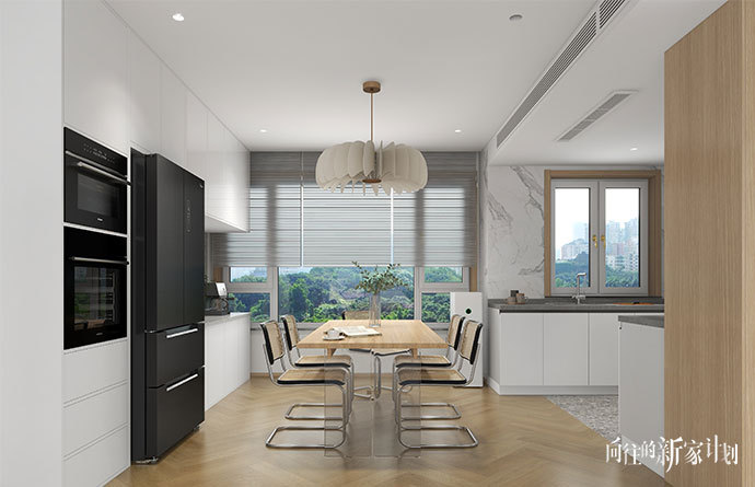 餐厨作开放式,与客厅相连,大面积的玻璃窗增加了通透性。其中内嵌式家电合理规划空间,石曜黑与素银点缀奶油色空间,简洁大气高贵不凡。