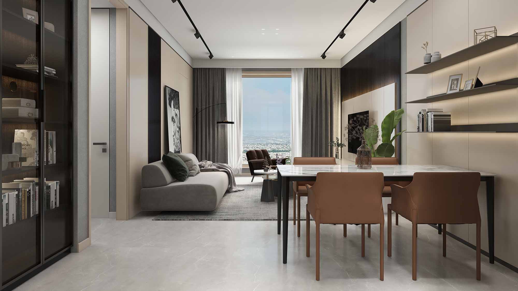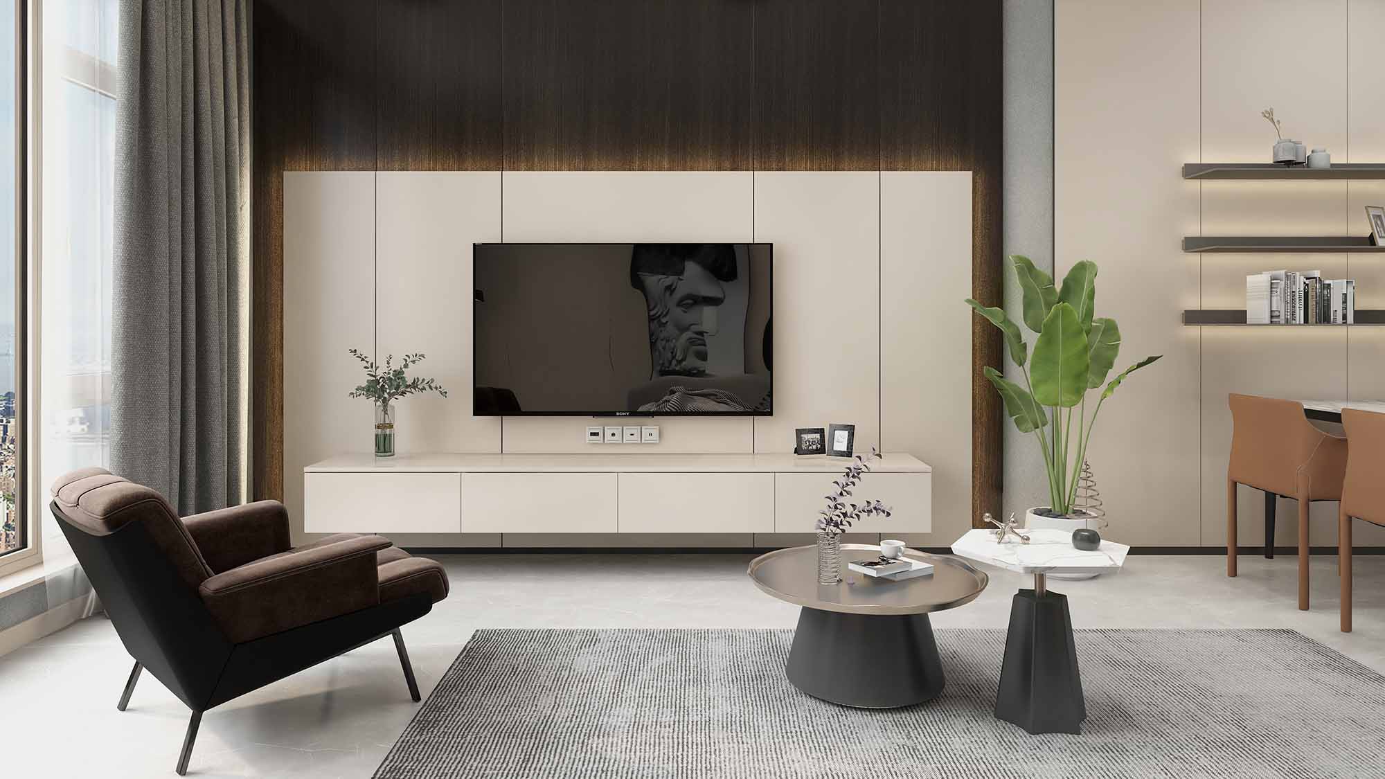 客厅几乎没怎么做复杂的吊顶,无主灯设计,空间更显宽敞。主要靠一些家具和软装布置起来的,像茶几、电视柜和边几的深浅搭配,空间有层次感,舒适又和谐。在墙面上,还使用线条灯带设计,更显轻奢氛围感,立马拉升空间档次。