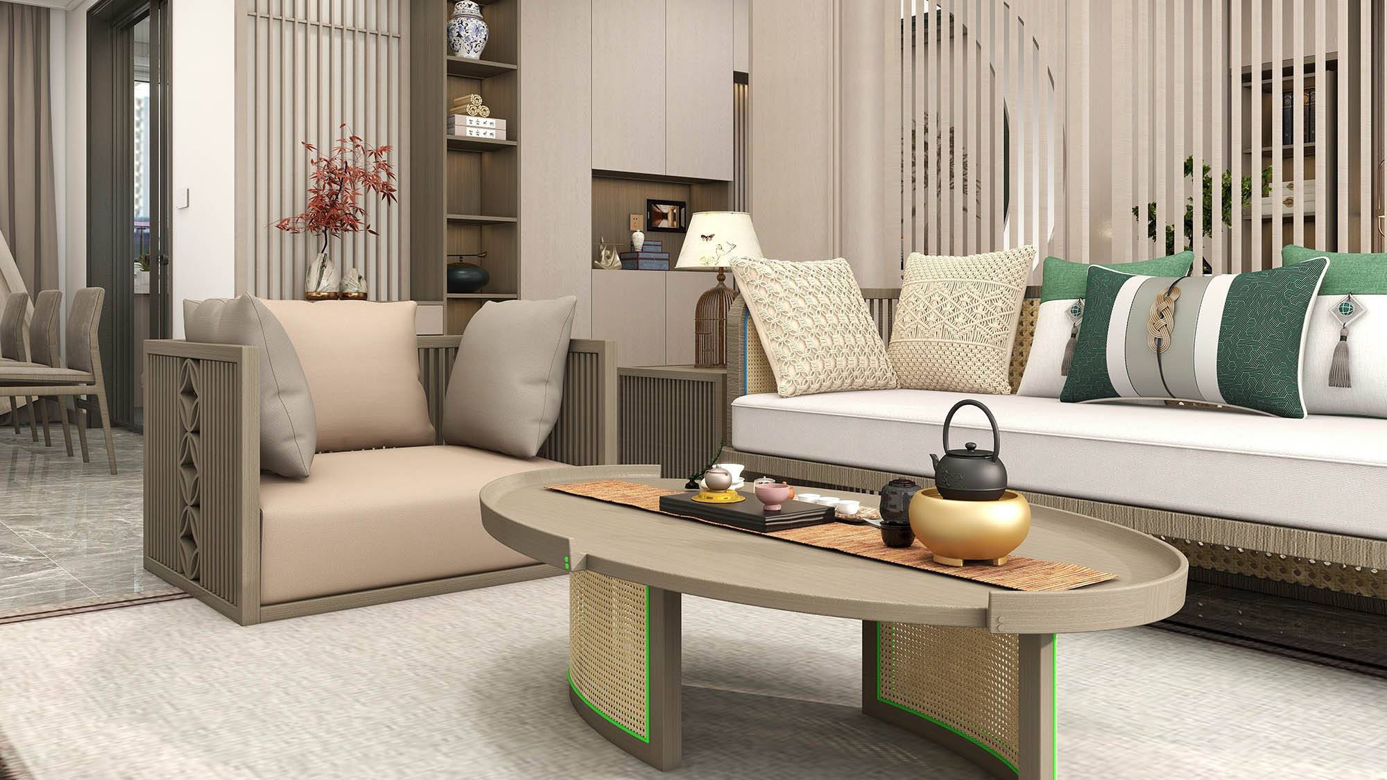 兼具功能性和美观度的协调搭配,在现代设计中融入屏风,松柏,轻中式元素。无需木地板,地面瓷砖和大理石也能在整体氛围中增添一丝氛围感。