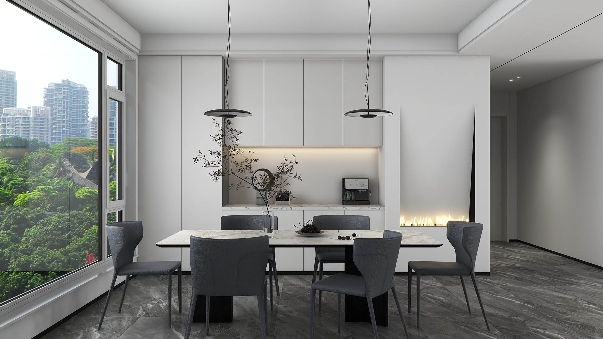 在墙面和储物空间的设计上,内嵌式餐厅储物让空间凸显高级质感,台面设计增加餐厅的使用面积