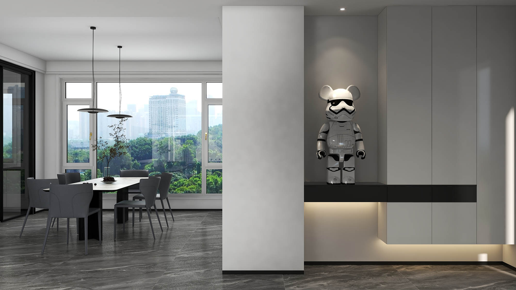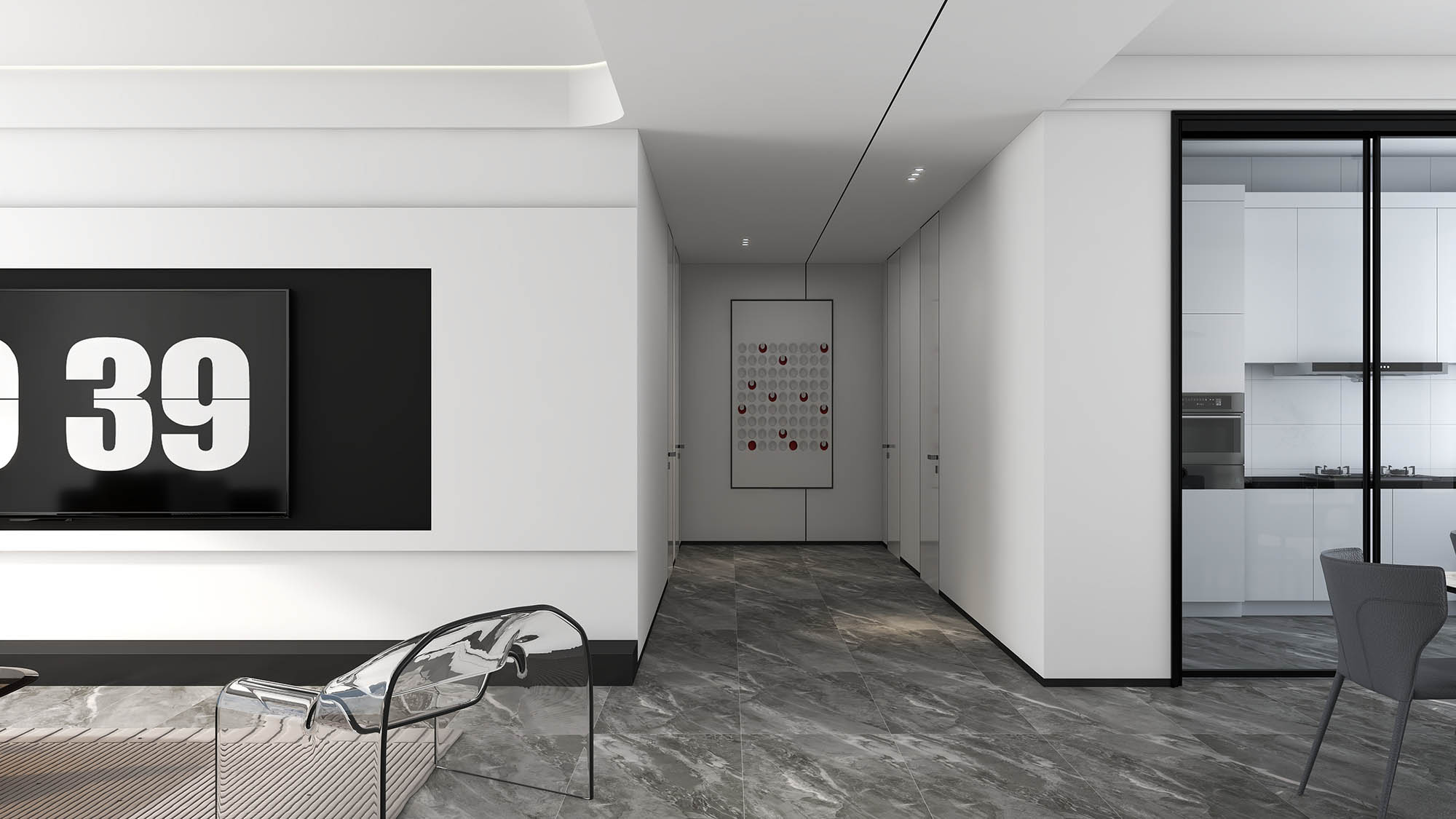 简洁风的黑白设计对材质有些更高要求,大理石和墙板的选择更需要突出:简约而有质感。软装的选择对设计师的品味要求会更高,把控格调的高级质感。