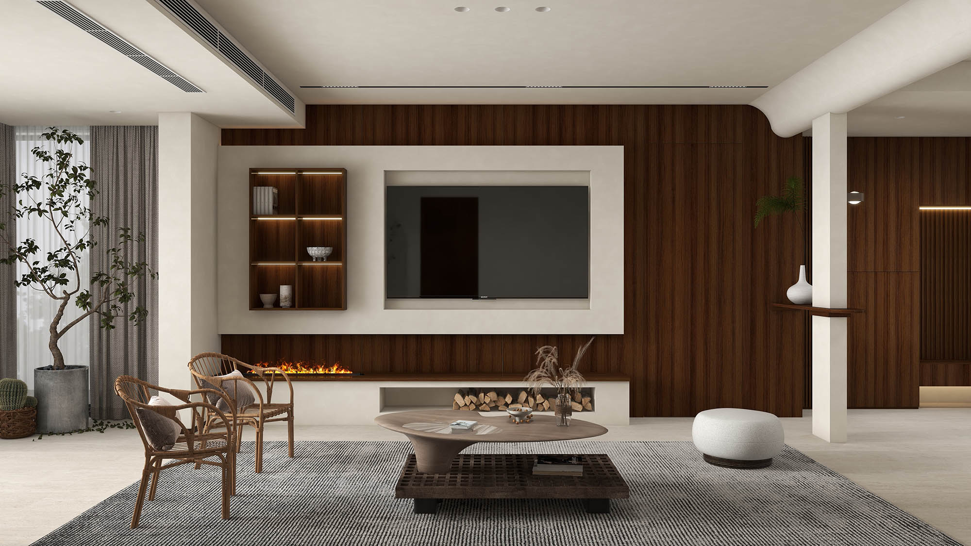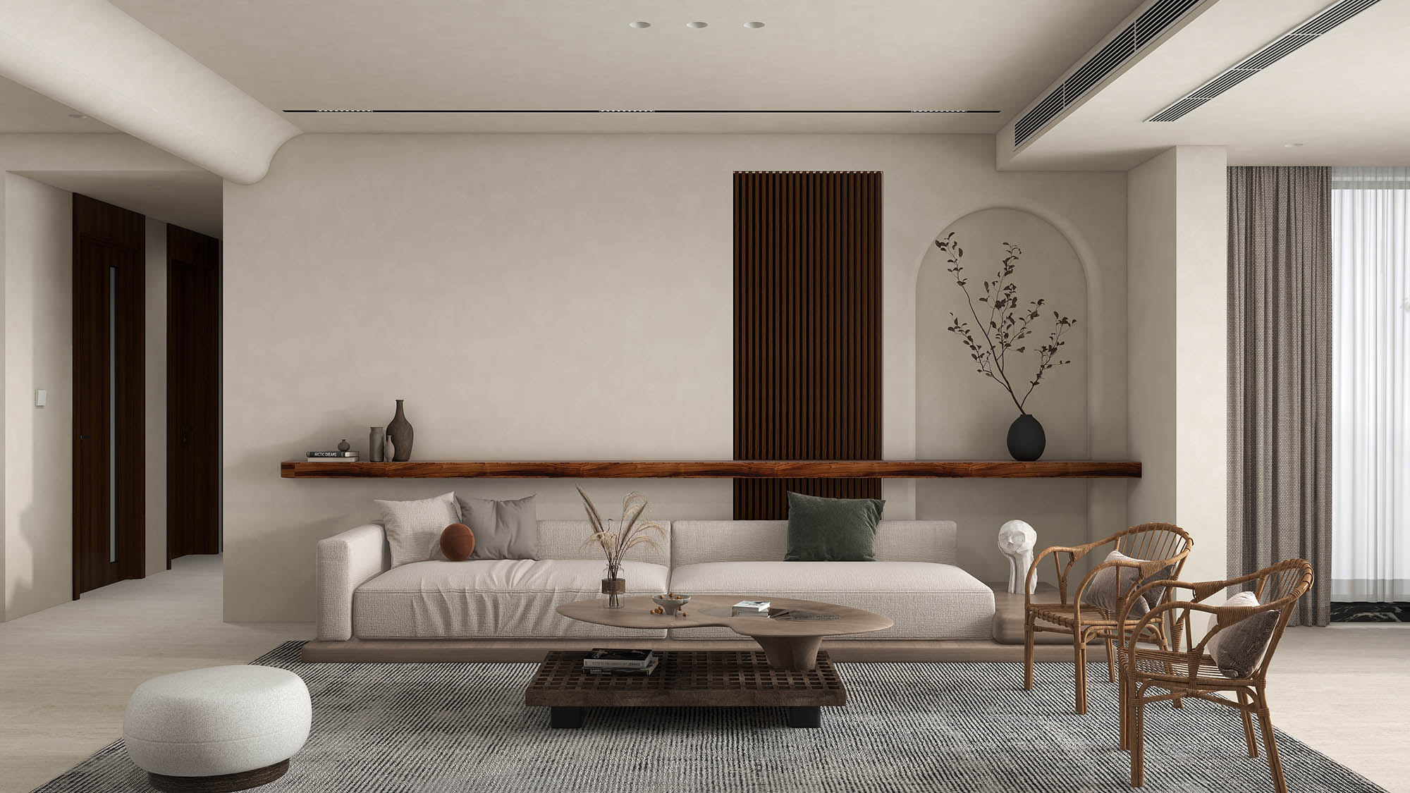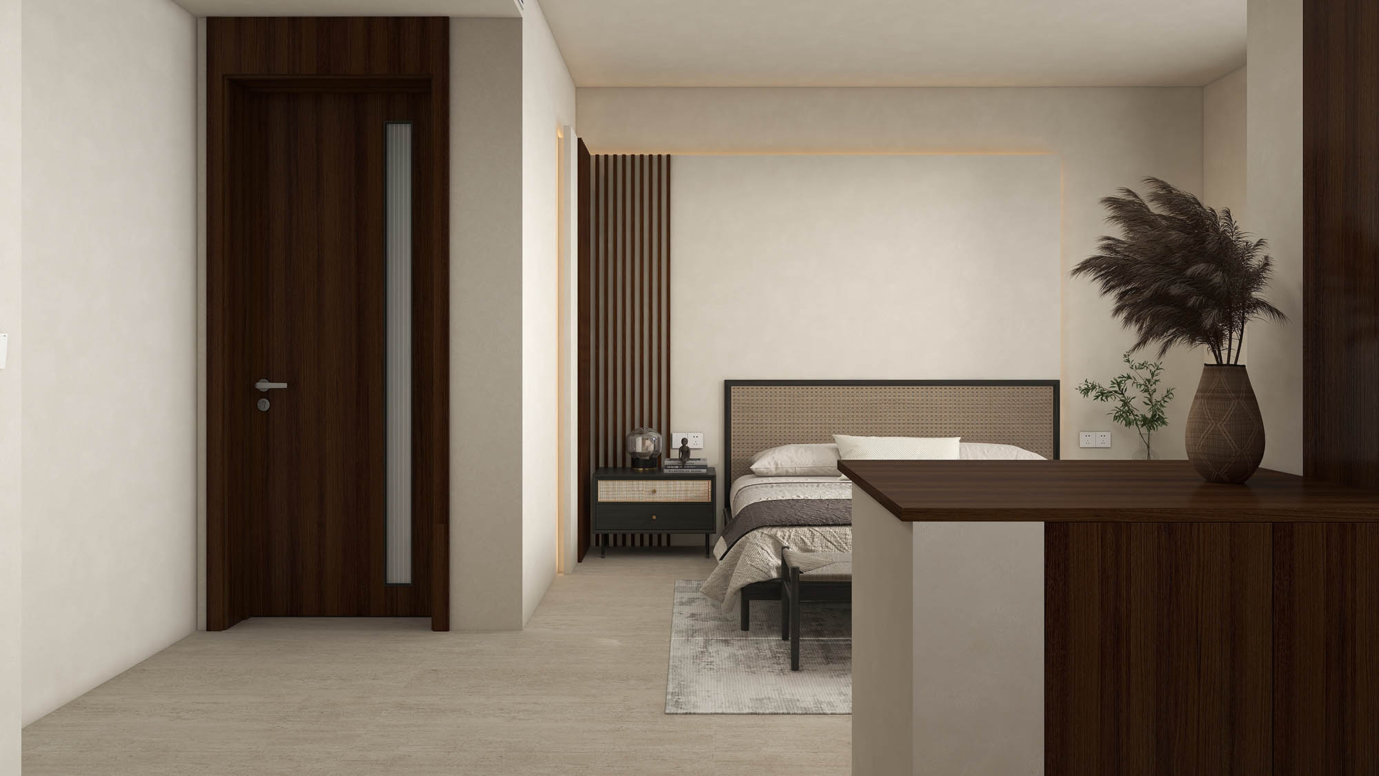 简白的墙体搭配经典木纹,以弧形融合竖纹背景墙,没有过多色彩的装饰,保留了实木的线条感,塑造纯粹娴雅质感。