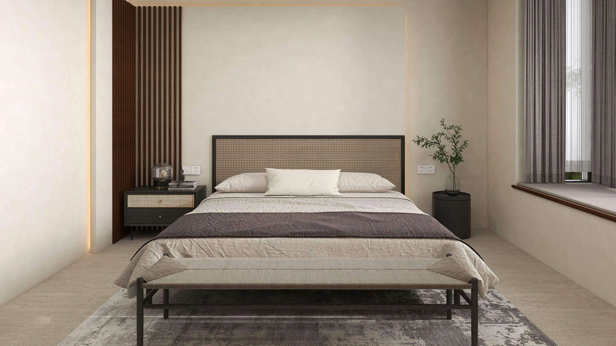 多重中式元素辅以原木色调软装,中式的床头搭配竖纹背景墙,于不经意间刻画出质感十足的东方美学的同时,让灯光隐匿,在深夜时点亮即能舒适阅读。