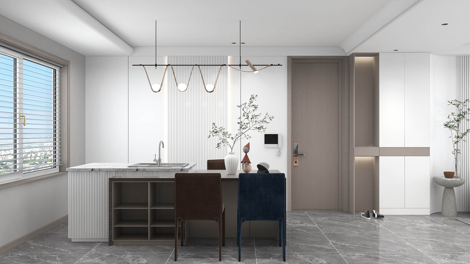 厨房是现代家居的灵魂之所,在空间利用上需要注重实用性。推拉门会是一个不错的选择,开关不占用空间。在滑轮选择上可采用静音滑轮,在滑动时可以减少噪音的产生。推拉门连接厨房与餐厅的空间,做饭时关上门阻隔油烟及电器声响,不做饭时打开门,空间视线不受限。