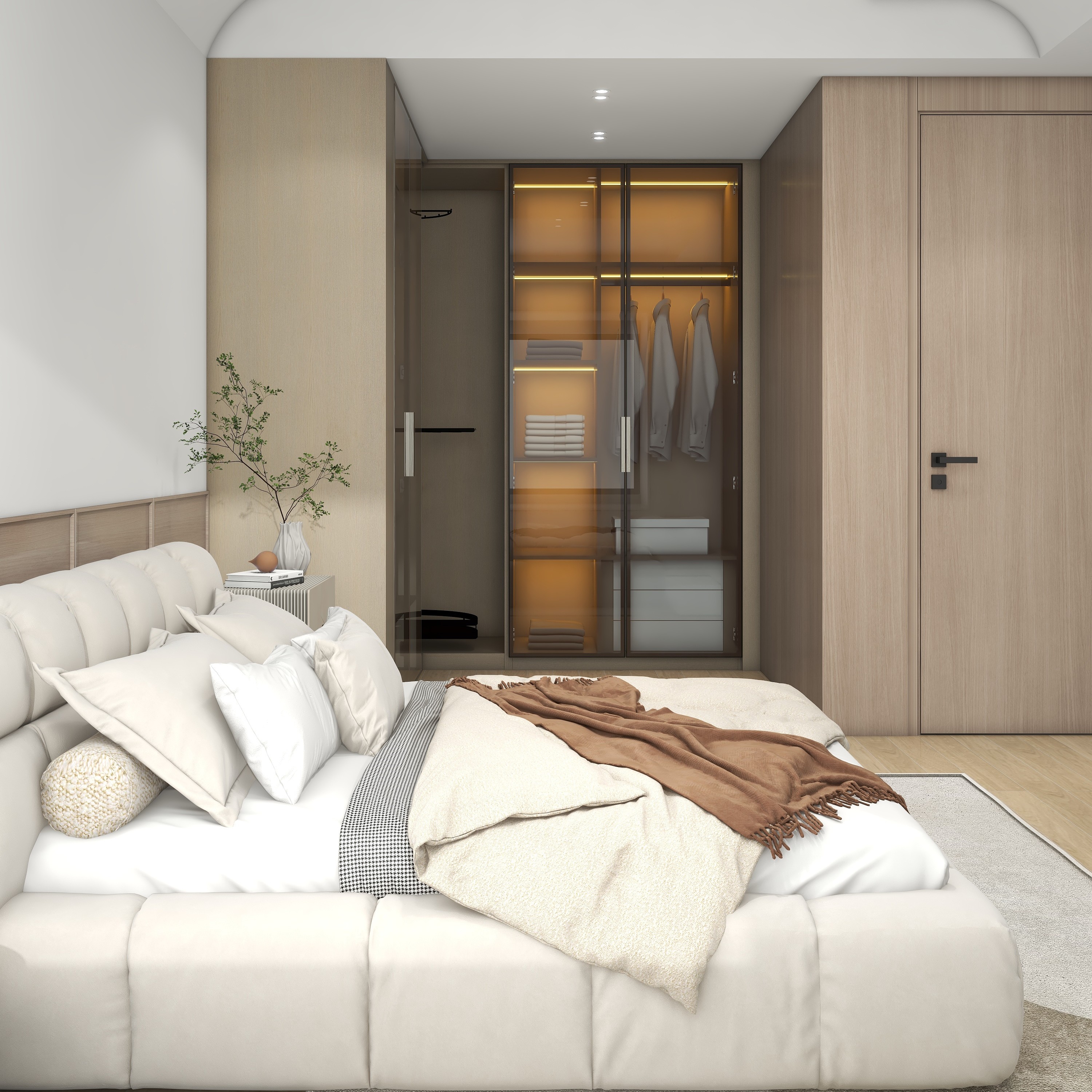 原木的色系运用于卧室中让人有充分的舒适感,它的色彩温和宁静,现代自然的优雅气息在微风中徐徐展开。