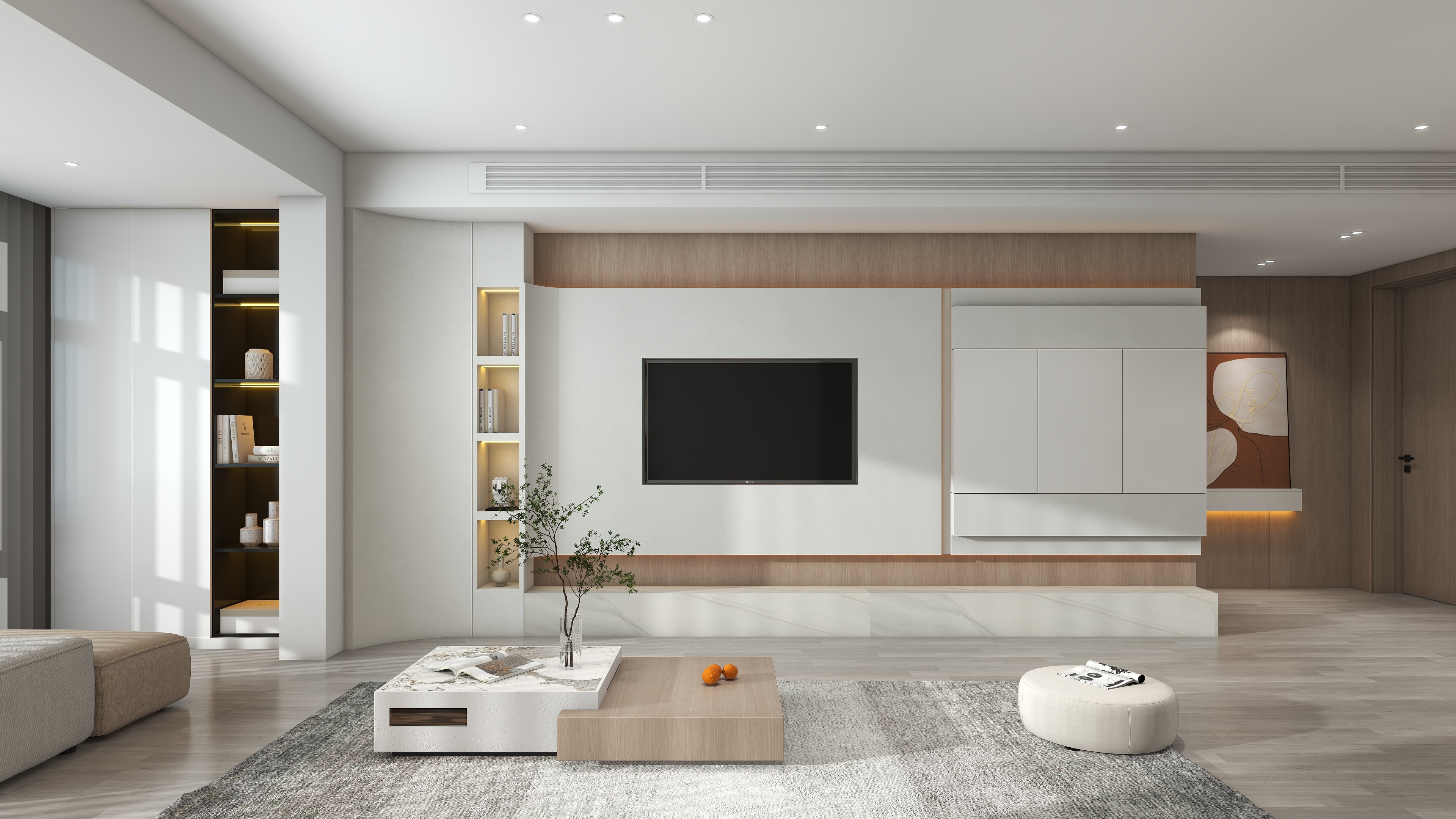 整体用贝母白跟北欧橡木木纹撞色营造温馨的氛围,墙面没有做过多的装饰,简而不繁。顶面与背景墙用弧形做转角,增加空间的艺术美感。
