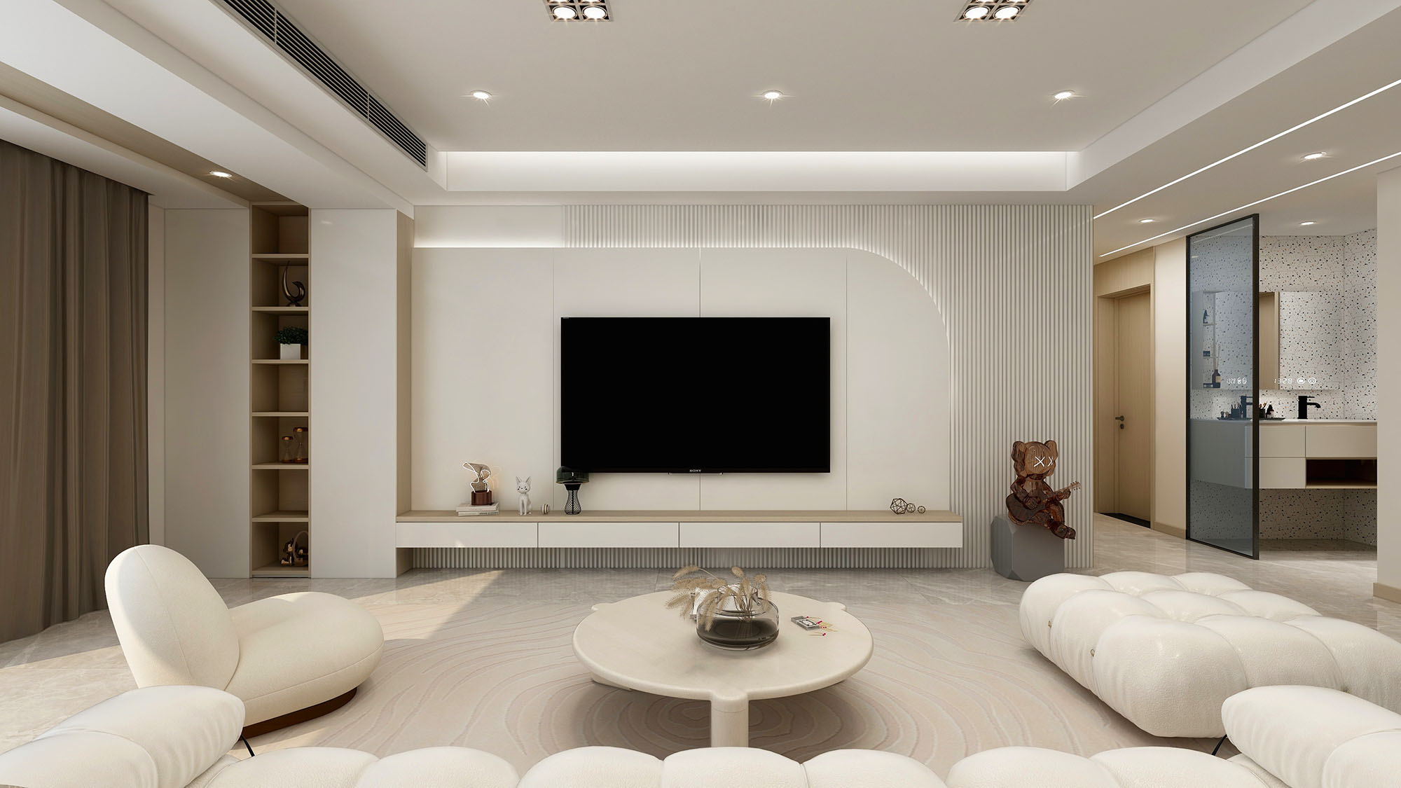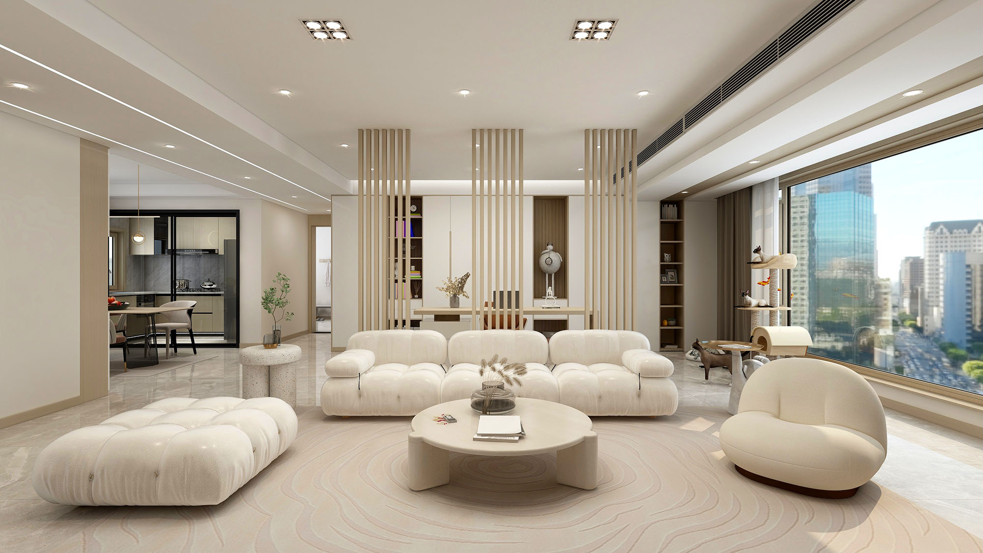 大平层户型也需要空间视野,通过栅格背景墙,即可做空间区隔,也保留了空间通透感。原木色系的搭配,让整体风格更显艺术气质。