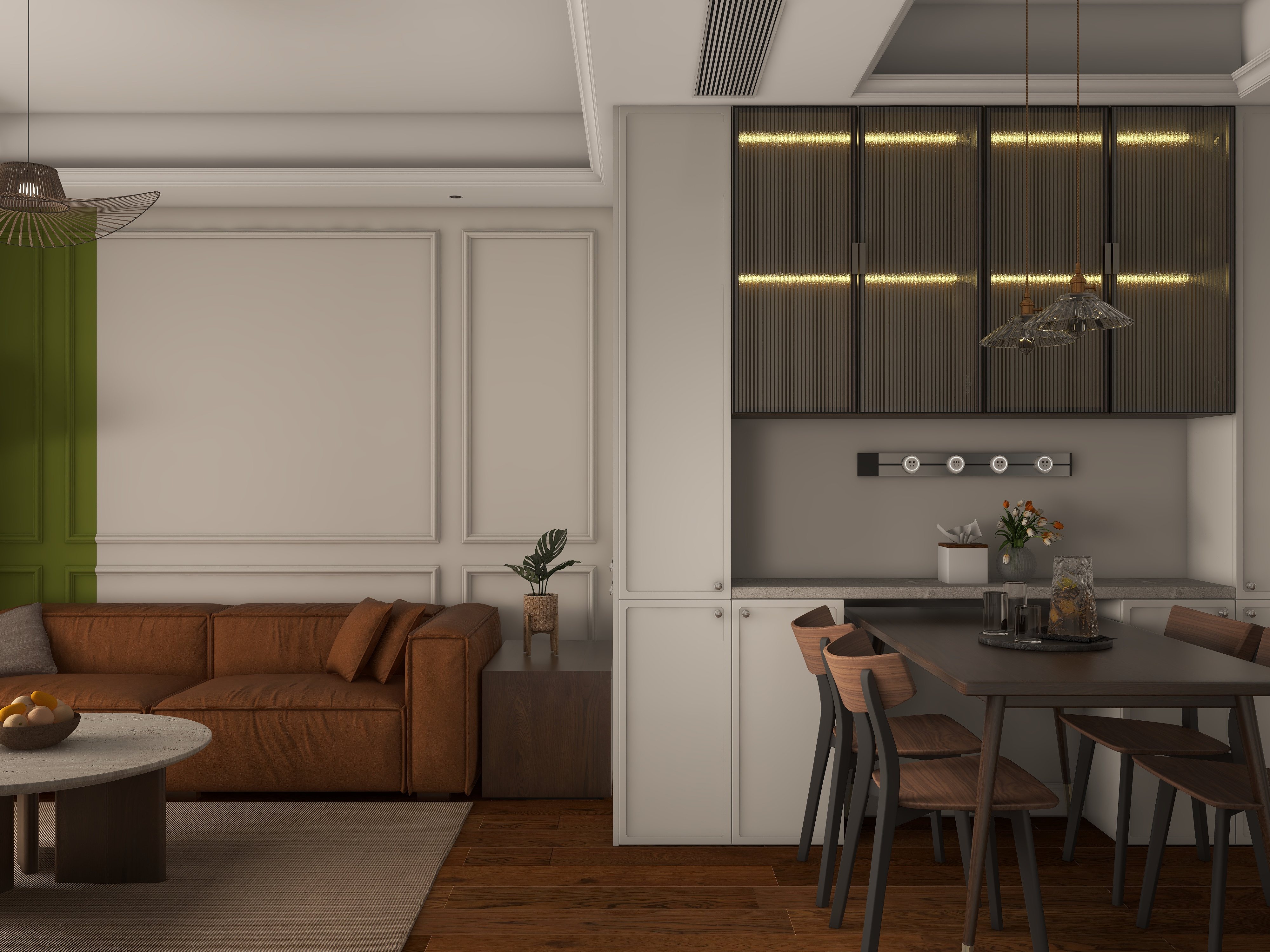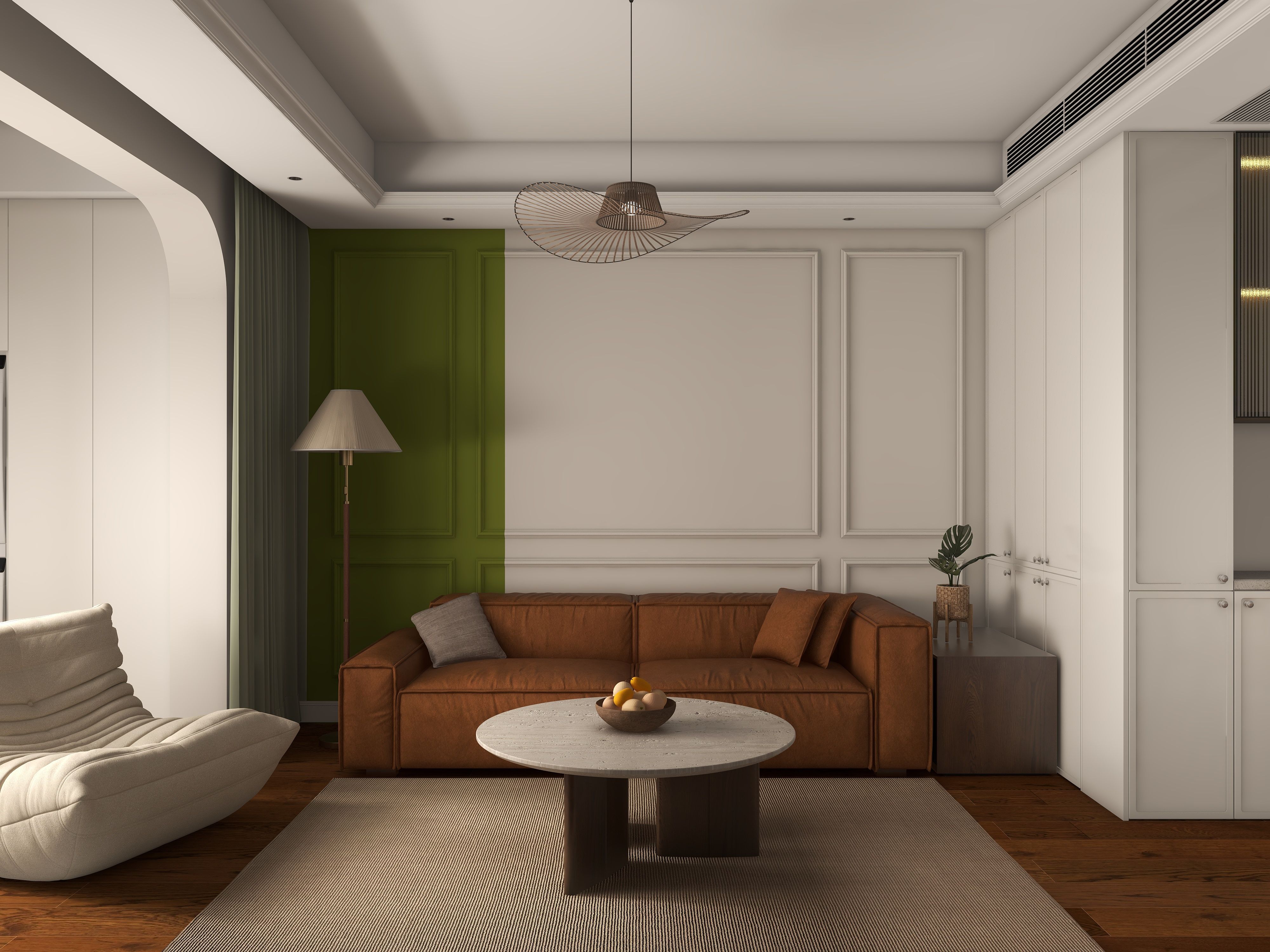 点缀部分的绿色,赋予空间时尚活力,棕色的木地板通铺,使得空间简单通透。