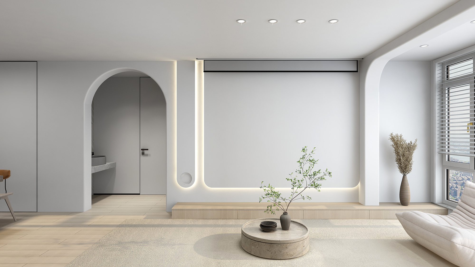 多采用白色、米白、原木色、灰色等低饱和色彩搭配,会让空间看起来更干净整洁。如果墙面和门板大面积采用白色系,可搭配木质地板、边柜等进行中和白色冷感。室内门可采用极简线条的设计感,既不打破整体的极简风格,也能在细微处有居者的设计巧思。