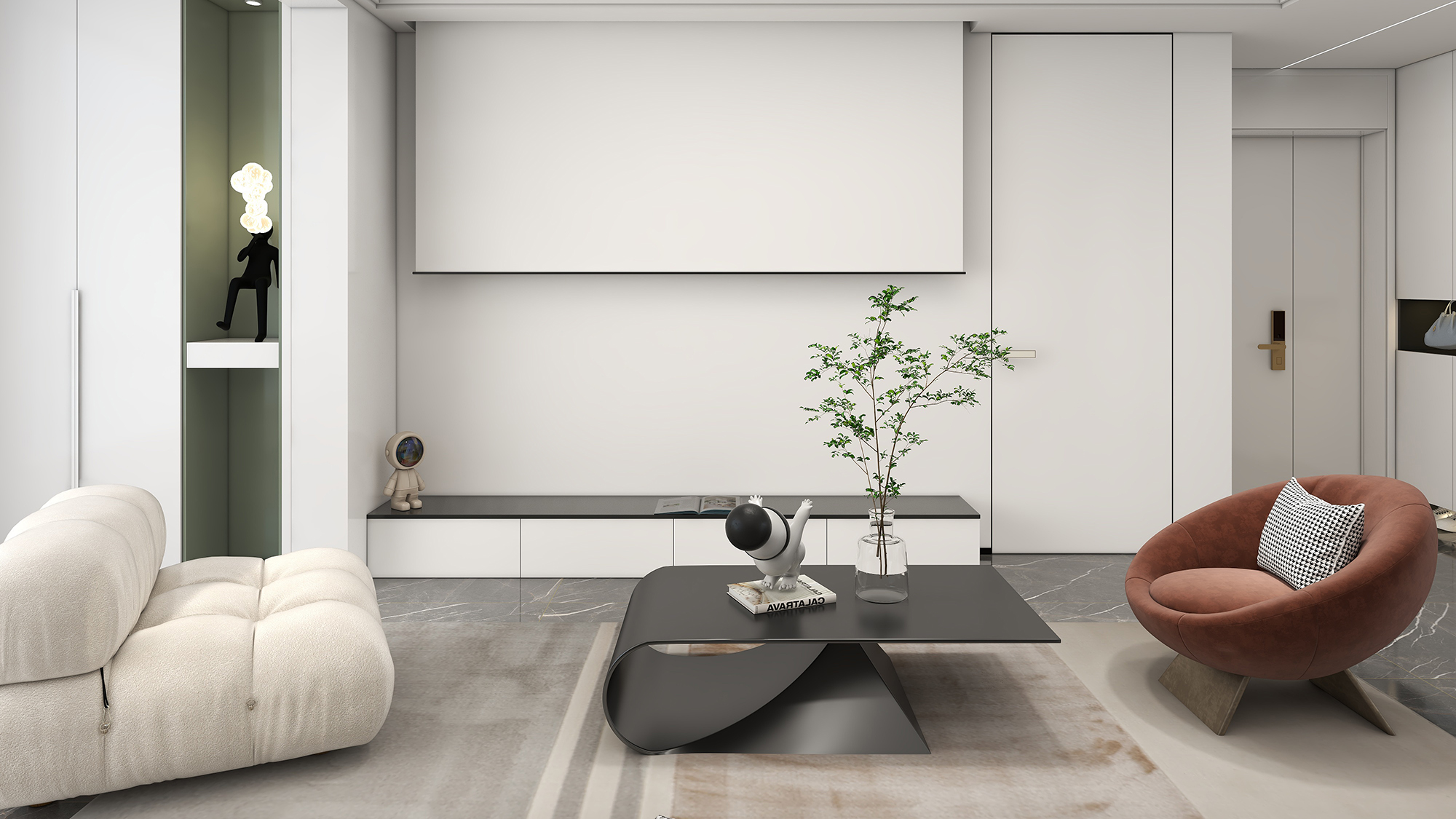 TATA极简无框门相比普通室内门在客厅区域的应用上,更具备视觉统一,平整墙面带来放大空间视野的效果,搭载TATA木门45°斜口磁吸,也可有效降低声音传播,营造舒适氛围。
