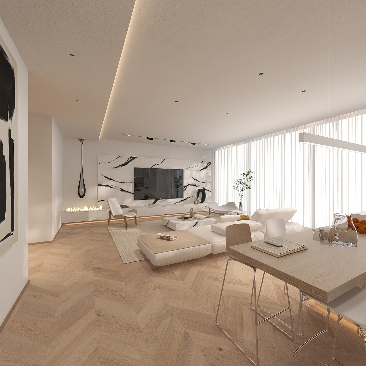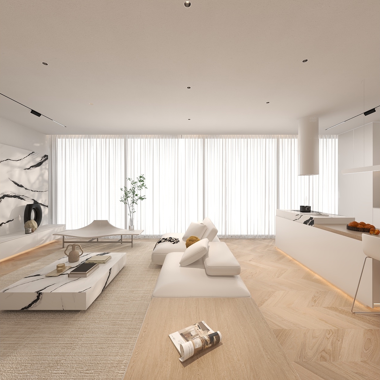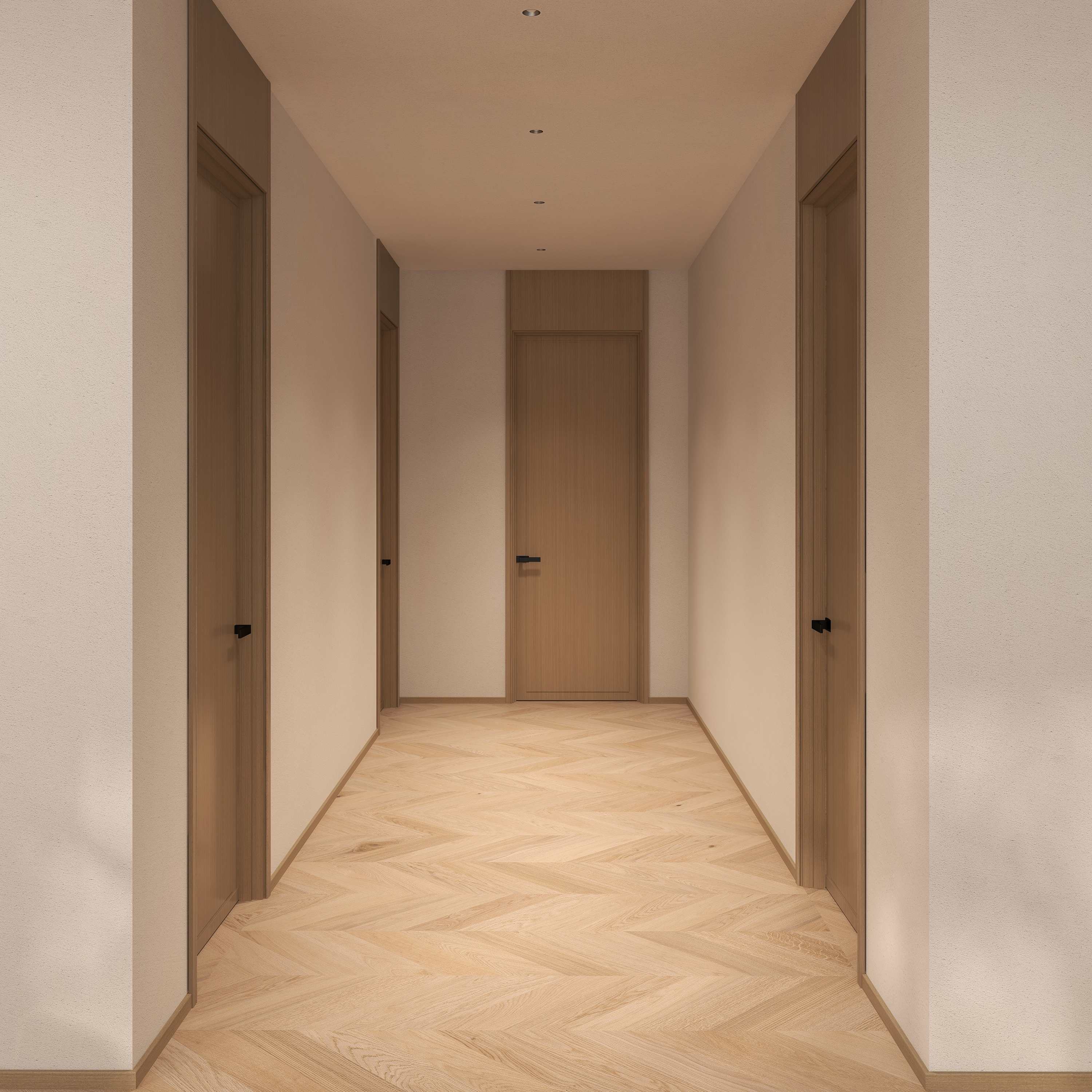空间中的鱼骨纹地板通铺是连接自然与生活的完美设计,室内门也是选用了原木直纹的材质,是一种偏奶油色系的木制色调,