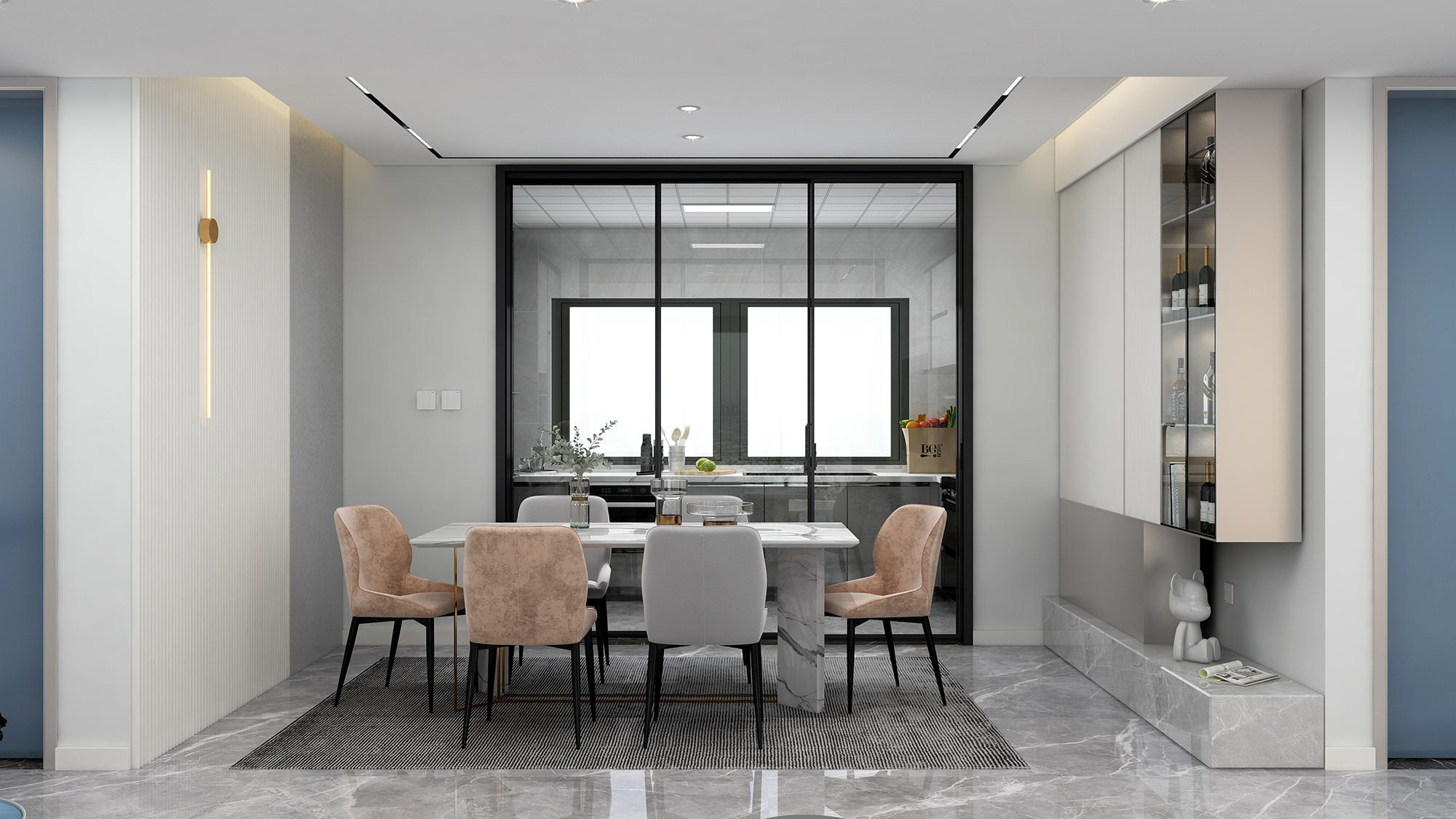 客餐厨的公共空间视野被打开,没有硬体阻隔,阳光和空气自在流通其间,就连必要的家具都尽量换成了极具线条感的造型,勾勒出轻盈体态,弱化了空间重量。餐厅部分岩板餐桌与皮质餐椅,在极简的空间中增加了一丝轻奢氛围感,绝绝子!