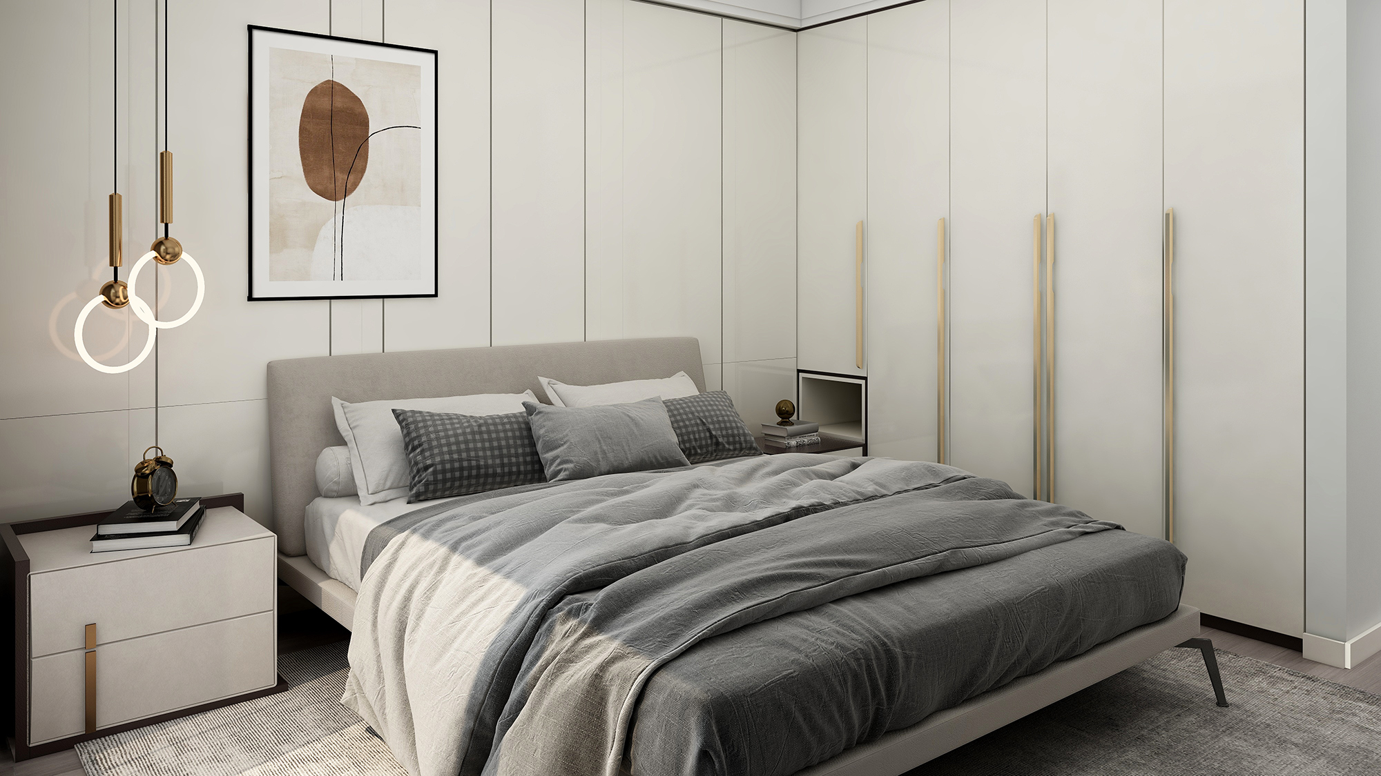 卧室的搭配主要是采用瓷白与原木色,阳光透过窗撒到床上,丝丝静谧与慵懒瞬间袭来。卧室的转角处是卧室的独卫,磨砂玻璃推拉门作为分隔,就连门框颜色都与室内适配,可以去雾的镜子是女主人的标配,一切都妥帖自然!