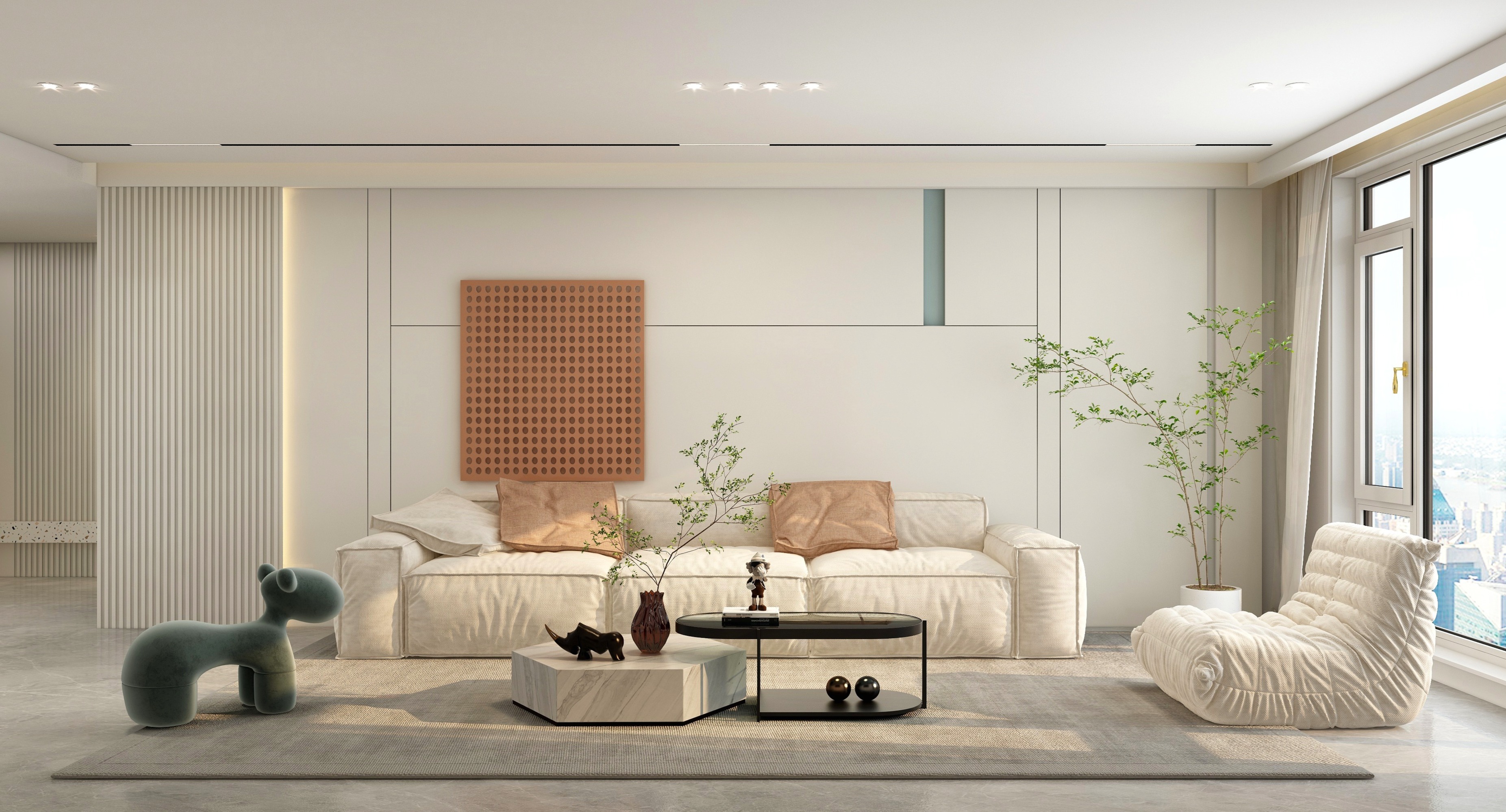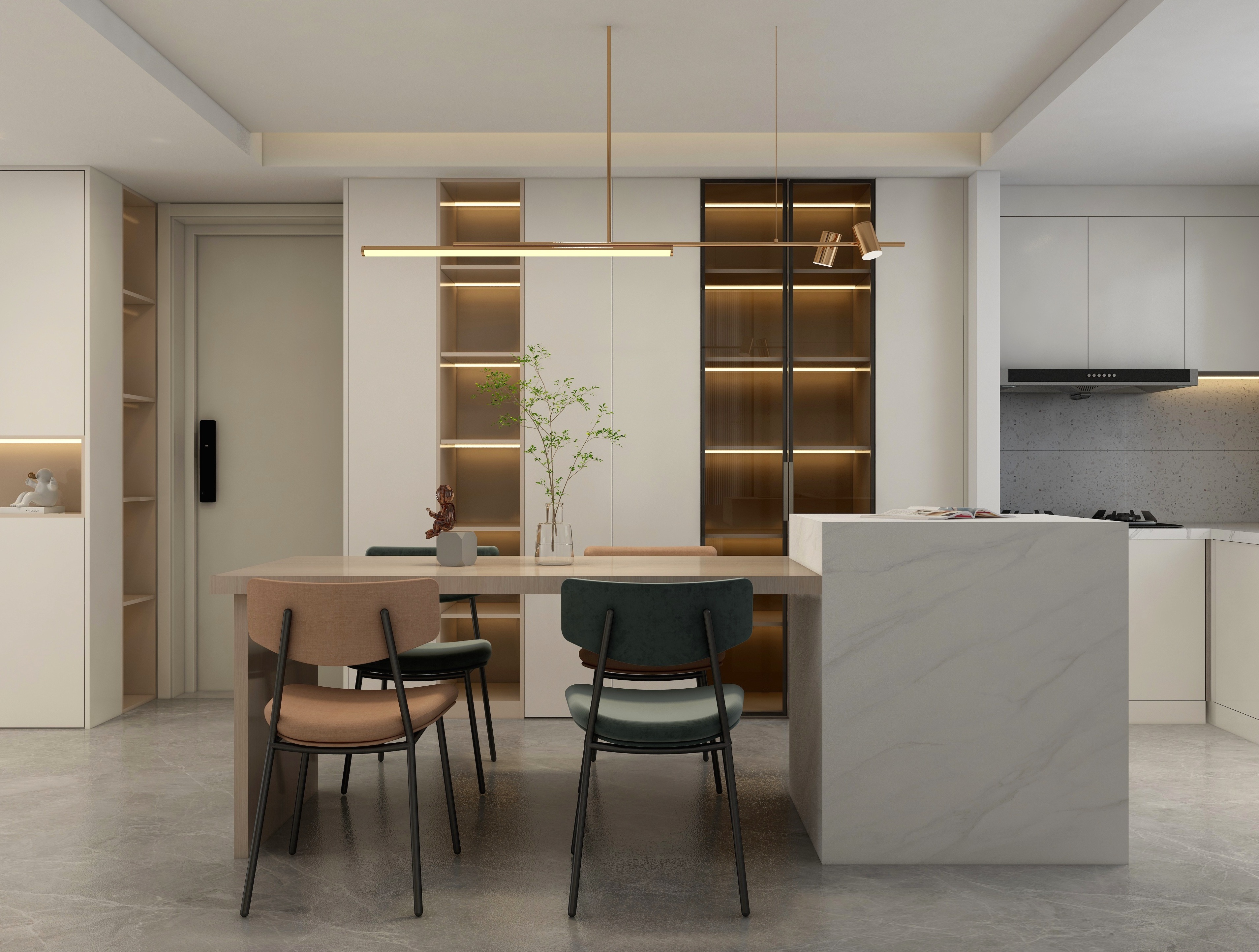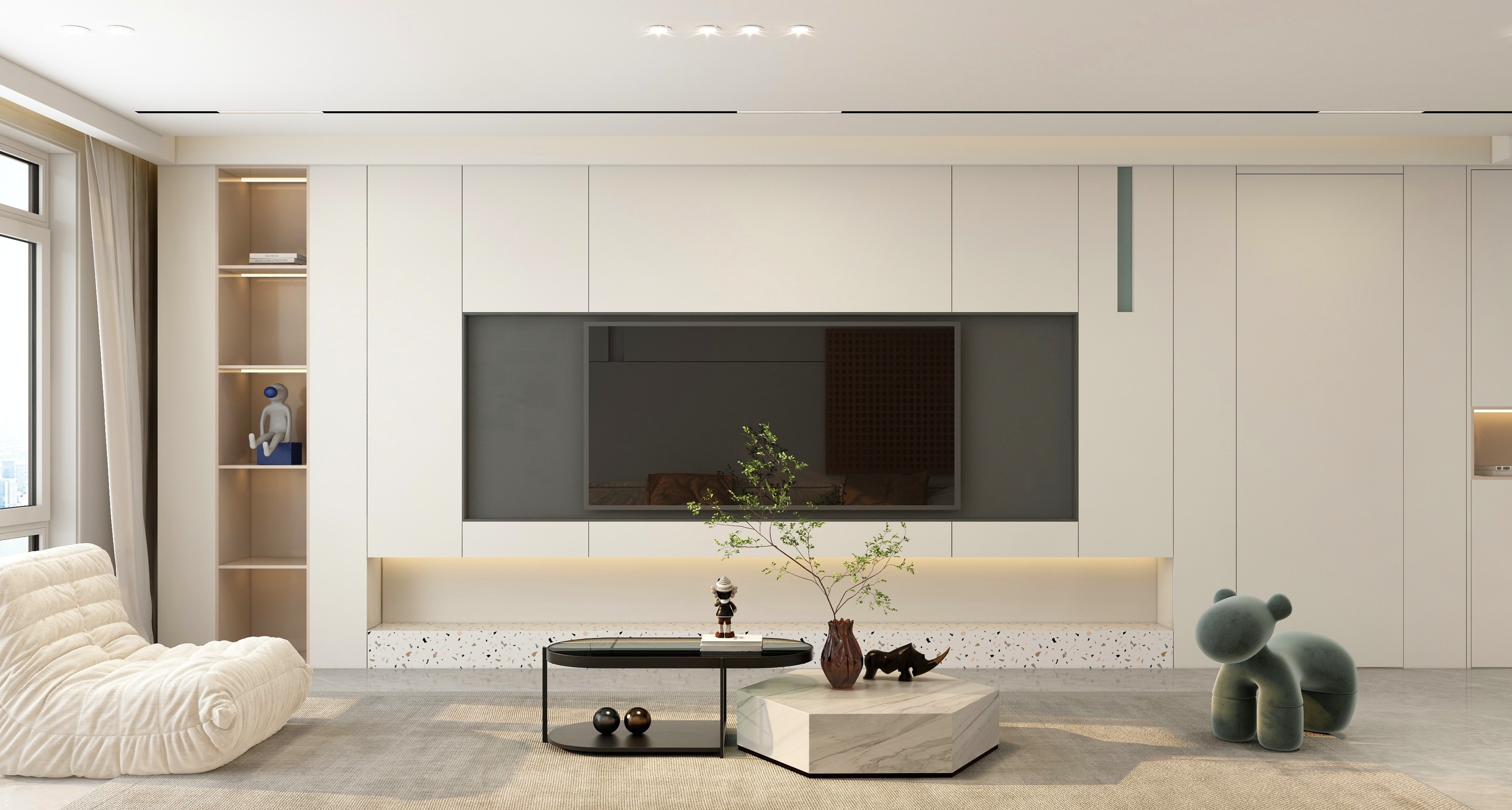 空间设计虽以简约为主,但又能营造出一丝轻奢之感。所以室内门大都是极简的造型,如客厅中的隐形门若有若无的存在,