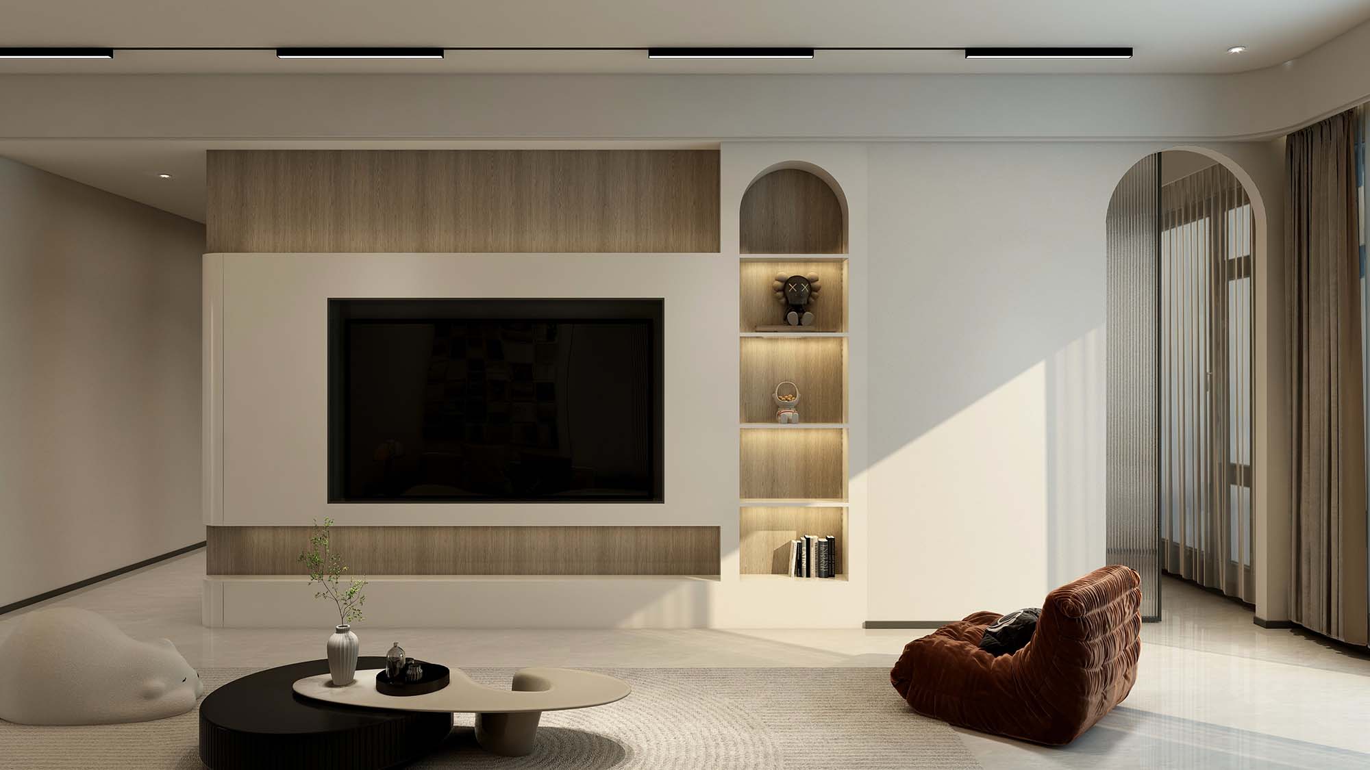 自由随性的布局。侘寂之美跟传统的对称美学不一样,它主张“不对称主义”。但却也简约随性,并且满足着主人的功能生活需求,又尽量保持布局中的“空”与极简。这样设计的储物背景墙,就是符合这样的需求,极简又能方便储物。