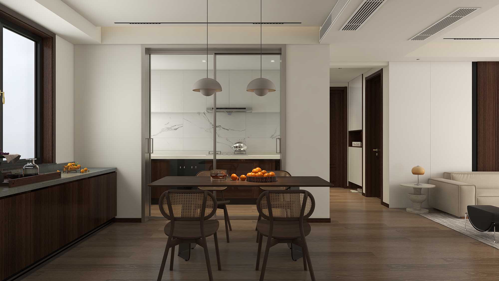 厨房餐厅是整个家里最有人间烟火味的地方,生活的柴米油盐是从这里开始。上面浅色的吊轨,下面深色的橱柜,每一处的溢出浓浓的复古电影氛围感。搭配极简推拉门,超低轨道,能让推拉更顺畅,清洁也方便,还能阻隔空间之间的噪音。