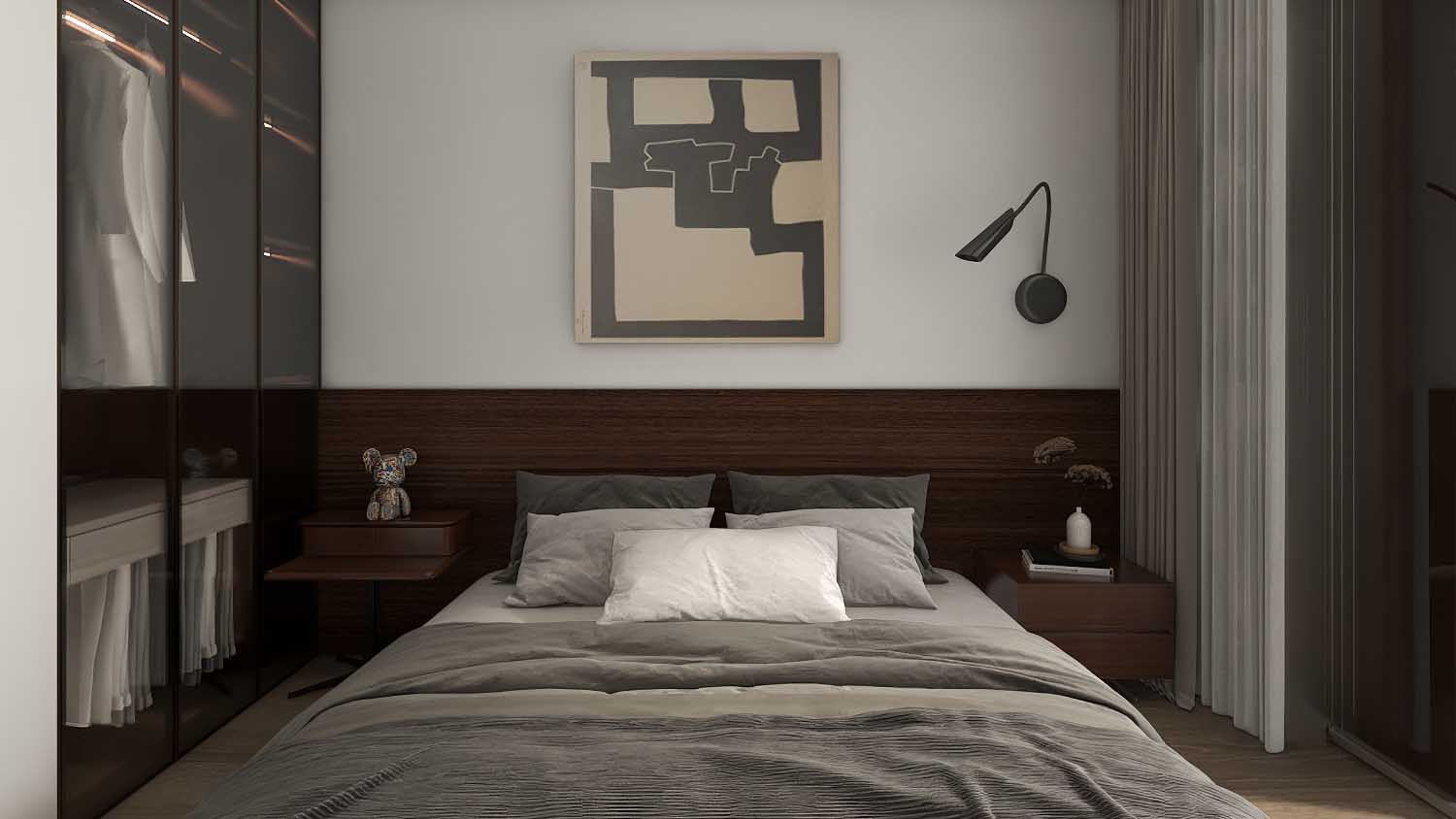 简单的卧室,素雅是它的主基调,可以让你在这个喧嚣的生活中提供一个身心放松的空间。烟熏尤加利的颜色,为空间增加了自然的气息与温润的触感,营造出更加真实的空间状态。轻奢感的定制衣柜,来源于TATA木门,别有一番风味。