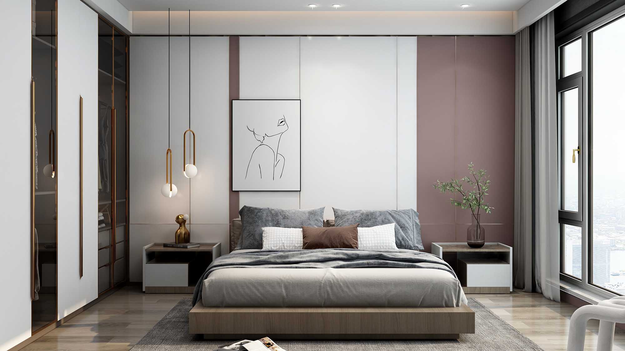 卧室床头墙是暗粉色+米白色的墙板,右侧加入黑色灯线的金属灯造型,而且室内衣柜也采用玻璃+金属材质的设计,冷暖交替的设计感也有着更独特端庄的效果;床尾倒是没有多余的装饰,搭配水泥灰+棕咖色的床与床单,使得卧室充满温馨优雅的现代感。
