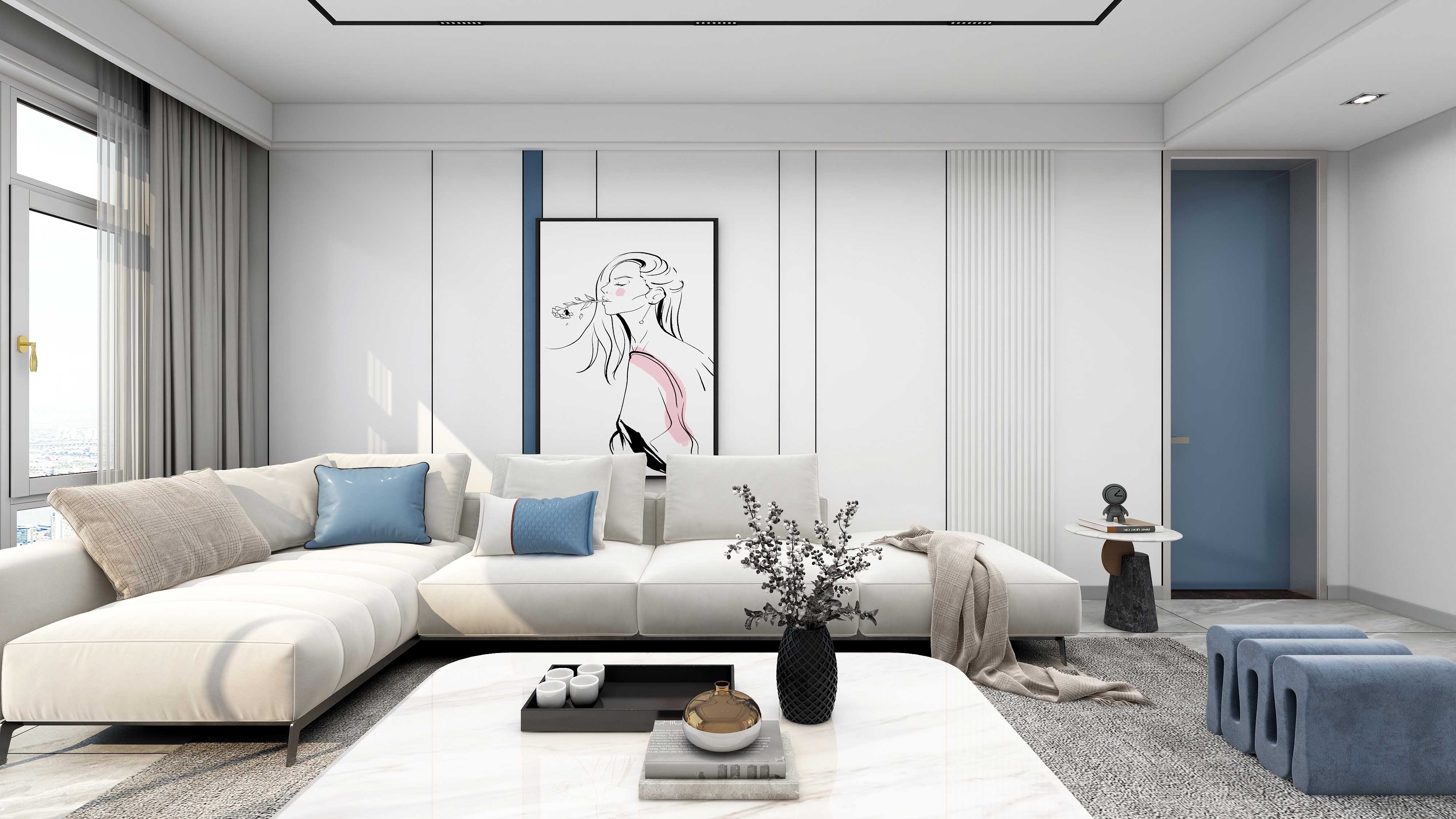 TATA木门降噪门-摩洛哥蓝,纯白色墙板为主色调,与摩洛哥蓝同色系的室内门作为局部点缀,加以蓝色调性的艺术摆件,简单优雅地便丰富了空间的艺术感受,错落有致的茶几,蓝色玻璃瓶等饰品既丰富的层次感和视觉上的艺术享受,又赋予了极致灵动的空间感,高级而不失趣味。
