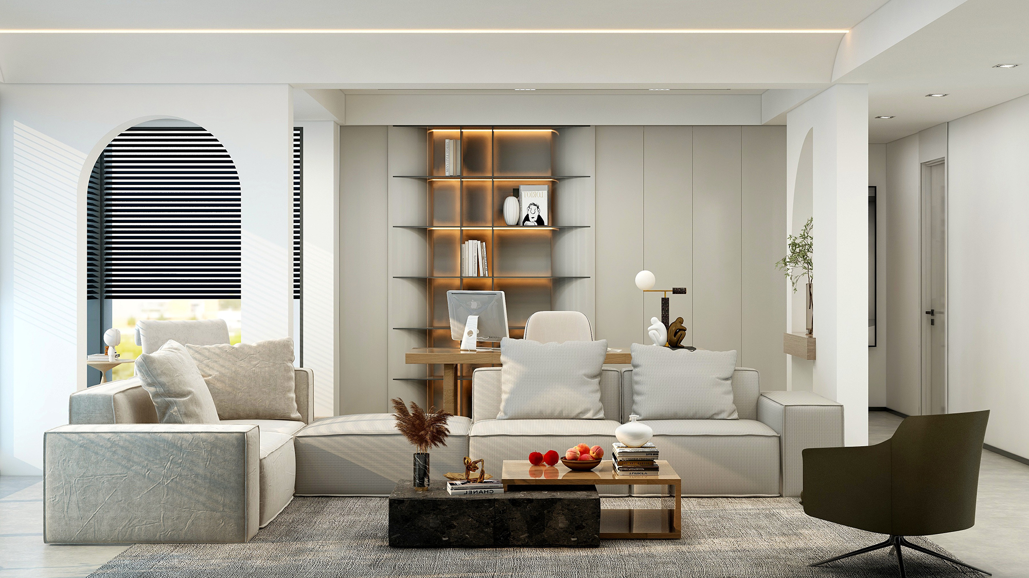 硬朗的柜门线条中,穿插弧形处理的台面,也充分软化了空间氛围。置放些许绿植,瞬间让整个家优雅而又有生活气息。