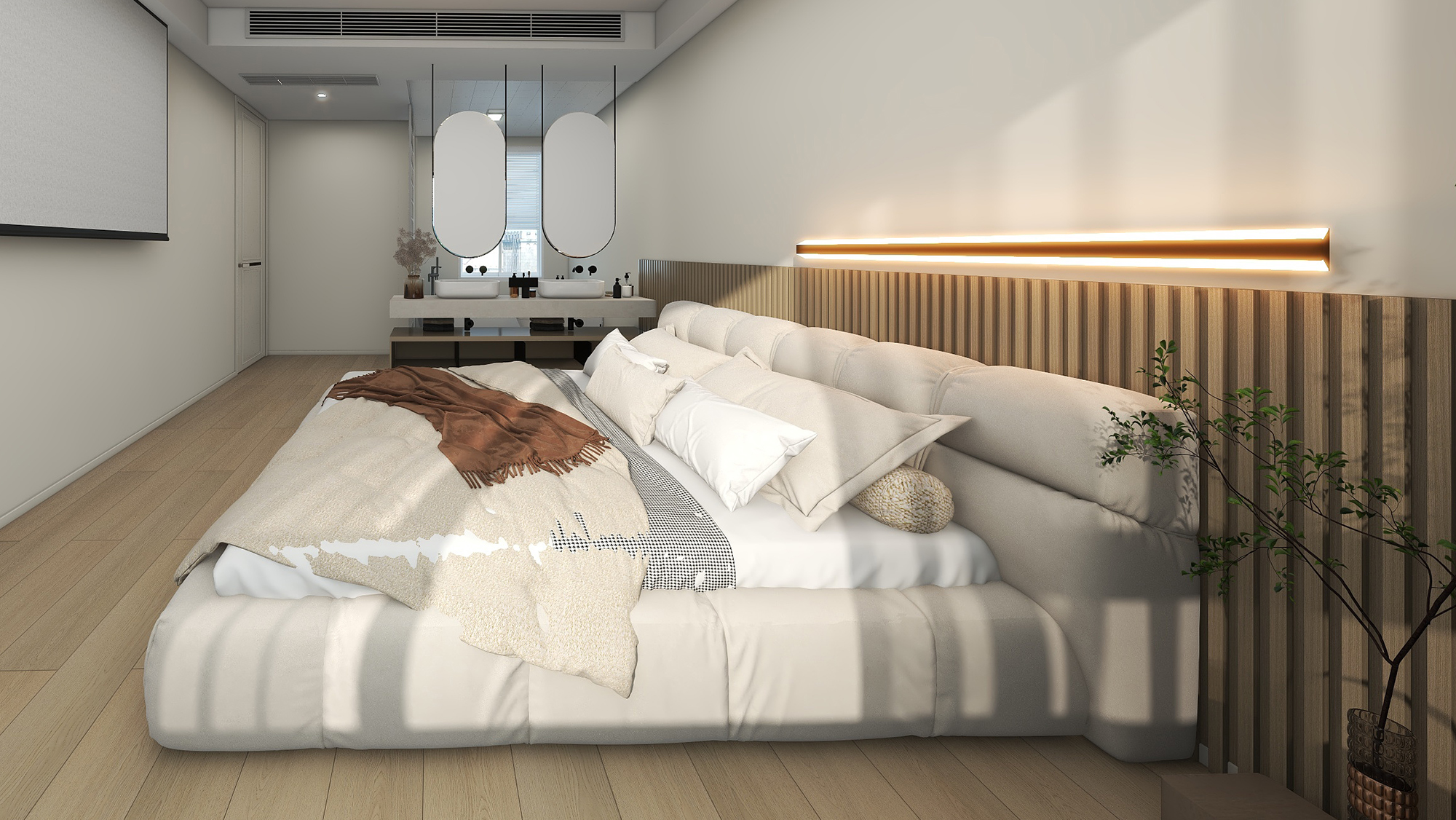 室内门选用了TATA木门降噪门——ZX101混油材质,通顶设计,拉伸了整体的视觉效果,降低了空间的重心。门款的斜口软磁吸设计,大大降低了家庭噪音的干扰整体基底是白色与原木色的搭配,灯带、金属元素绿植等元素,给宁静的环境注入了恰到好处的治愈感。