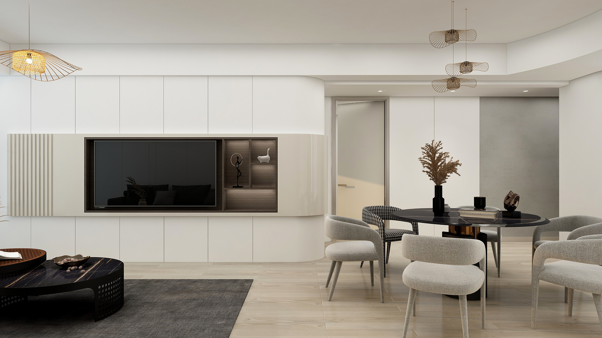 色彩与体块的结合伴随角度与造型置入有序,顶部横柱以灰色抑制大面积白的飘忽,舒适闲散却也沉稳可控。利用墙体和柜体对梁的咬合法,凭借功能间的辅助削弱顶部横梁对餐厅空间的影响。