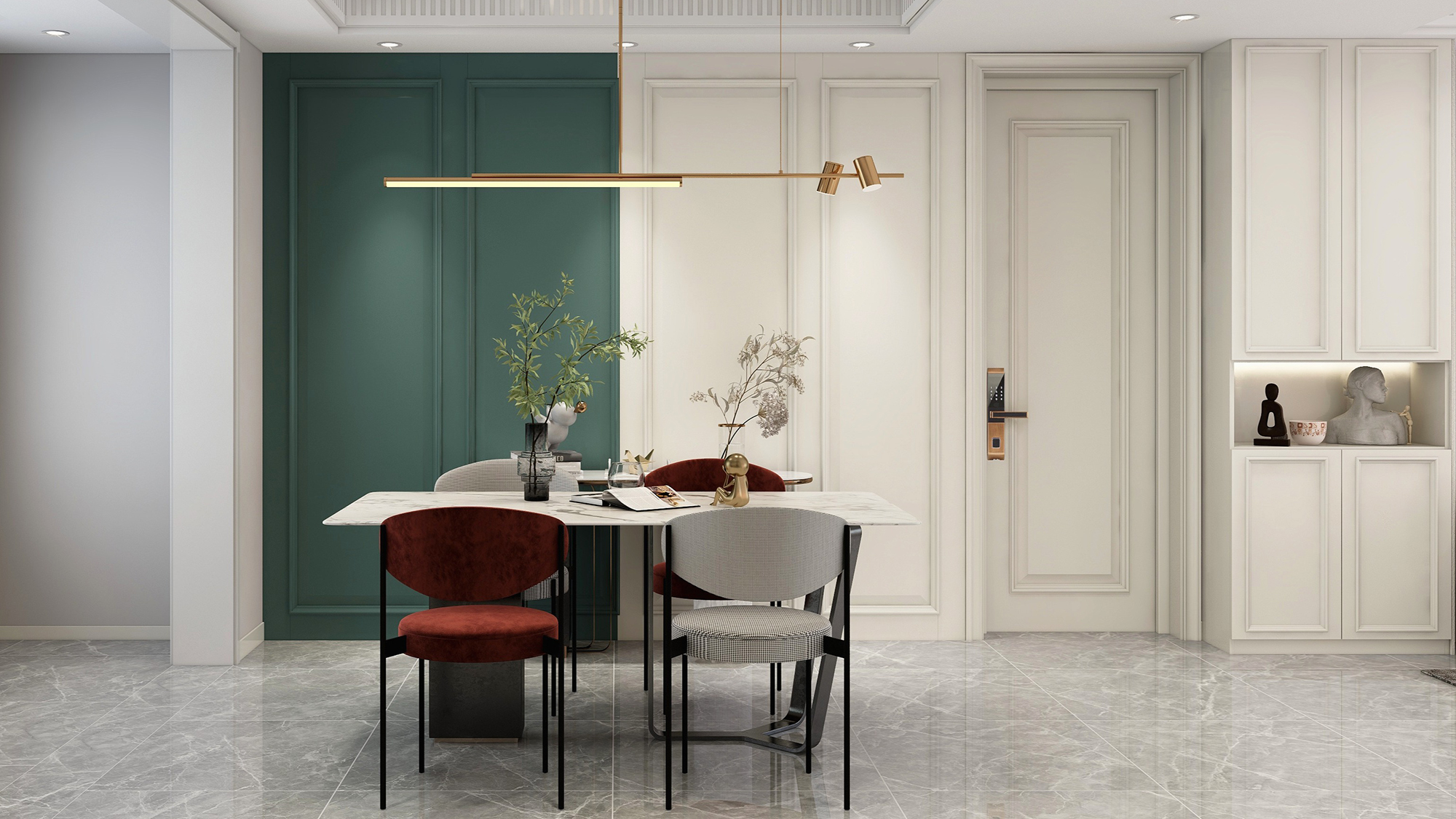 餐厅墙面也使用了绿色,和客厅颜色呼应。桌子以大理石和金属搭配而成,放置上一些摆件与绿植,让空间更加有品质感。