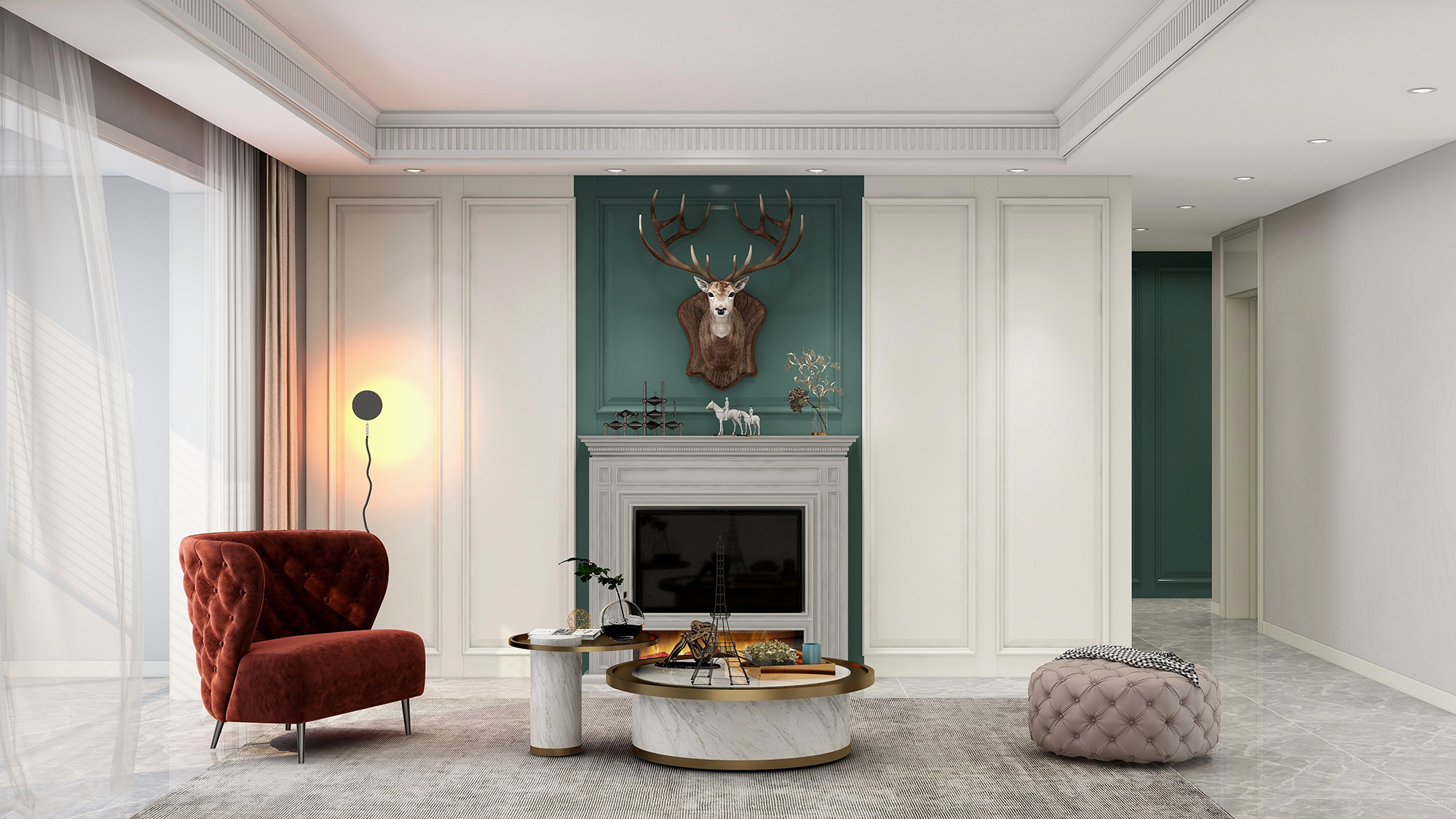 客厅电视背景墙,造型采用欧式经典造型凸显欧式风格的气质,同时白色和绿色的配色在视觉上使空间更加平衡和跳跃。