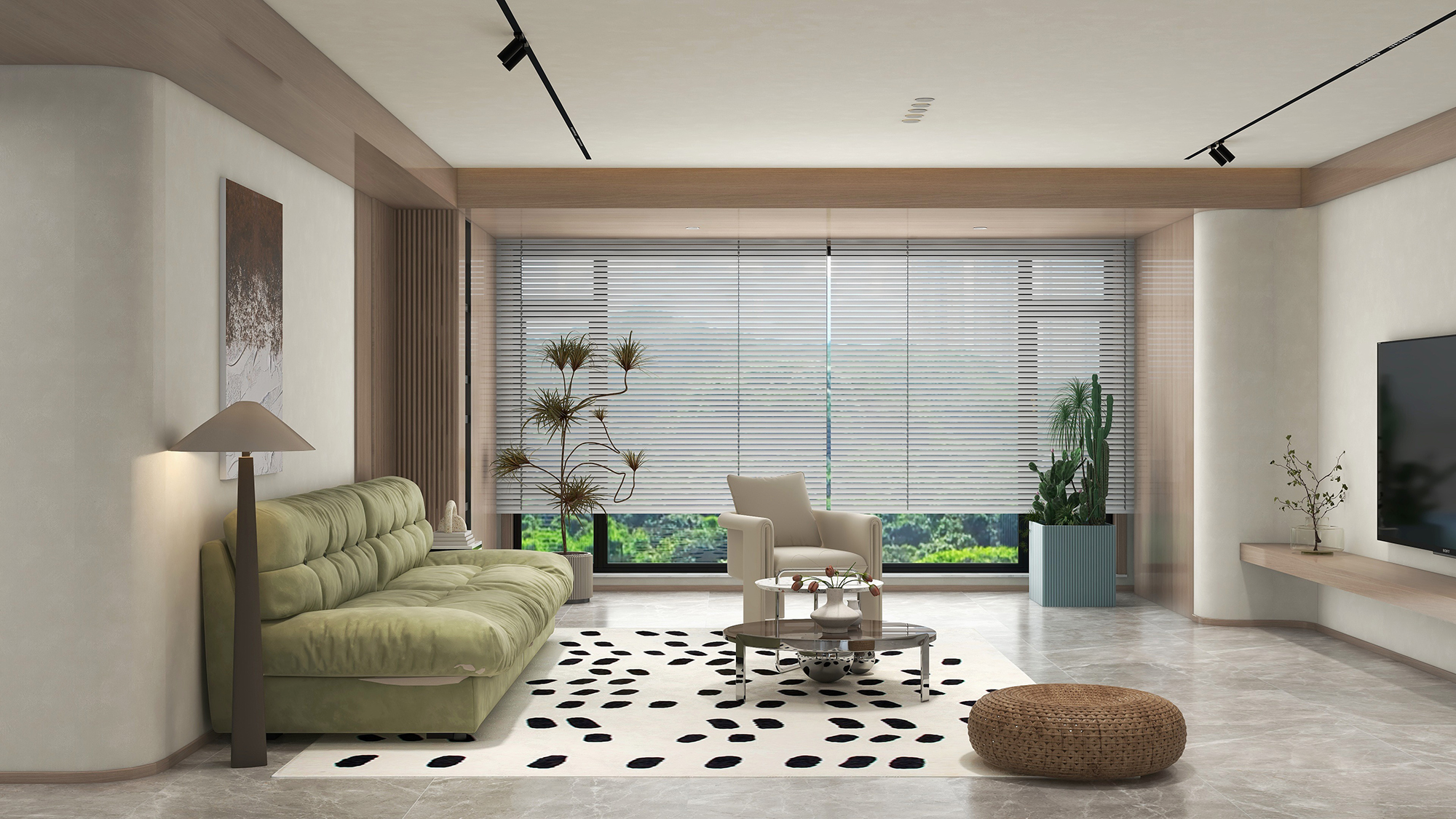 客厅运用大面积的白色,给人清新干净感觉,通过不同材质的碰撞勾勒了空间的轮廓。将黑色、白色、原木色交织在起,创造了干净且安静的室内空间。客厅的电视背景墙选用了轻奢质感的墙板,非常有格调,同时又和北欧风完美融合。简约的家具布置,黑白相间的地毯,搭配绿意满满的自然装饰物构建出一个不加虚饰、简单纯粹的家,足以让人忘却所有的疲惫。近似落地窗,增加了客厅的采光,平日里窝在沙发里看会书或看会儿电视,体验生活的惬意与美好。