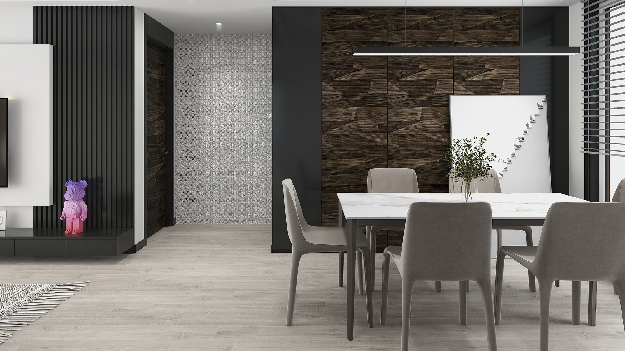 一个家里面,最能凸显品味的无疑就是客厅。背景墙采用摩卡纹墙板,营造出简约时尚的空间感。加上艺术感时足的吊灯元素营造出轻奢的感觉。这样的搭配使空间在简洁之余,不失大气高贵。摩卡纹墙板的运用延伸到了电视背景墙。简单却充满幸福。还是摩卡纹,用在餐厅又是另一番风情。