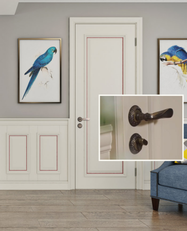 JO011嵌艺,带有一点欧式田园的气息,搭配的五金SN203采用仿生莲蓬与鸭嘴结合的设计,与门搭配起来非常的协调,相印成趣。