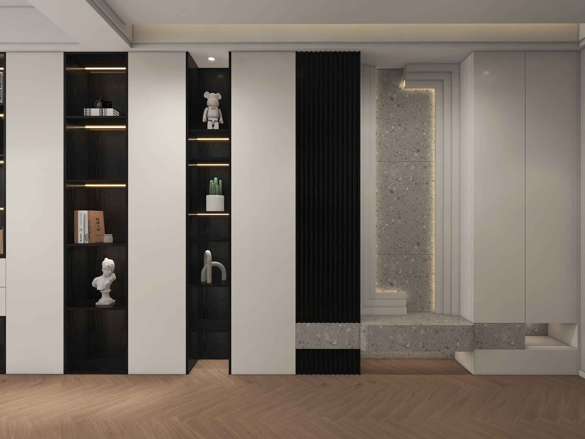 衣柜收纳柜的设计融合到背景墙,不仅满足收纳需求,还让室内活动空间变大。同时,在视觉感受上,会让人在家眼前一亮。