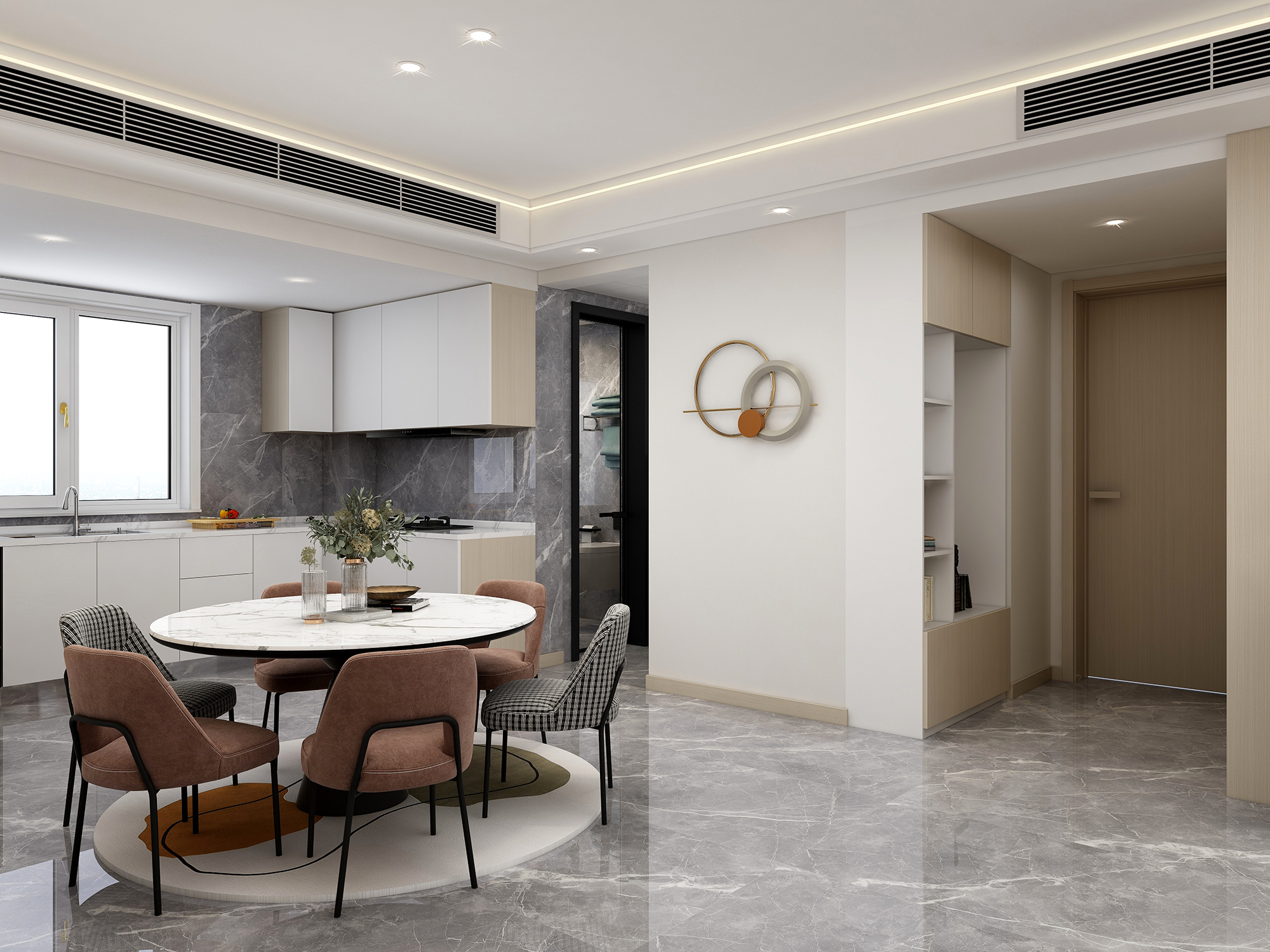 敞开式厨房充分利用转角处打造半入嵌式衣柜,柜门配色更好地融入空间整体性。日常杂物放入柜子,让房间看起来更整洁干净。