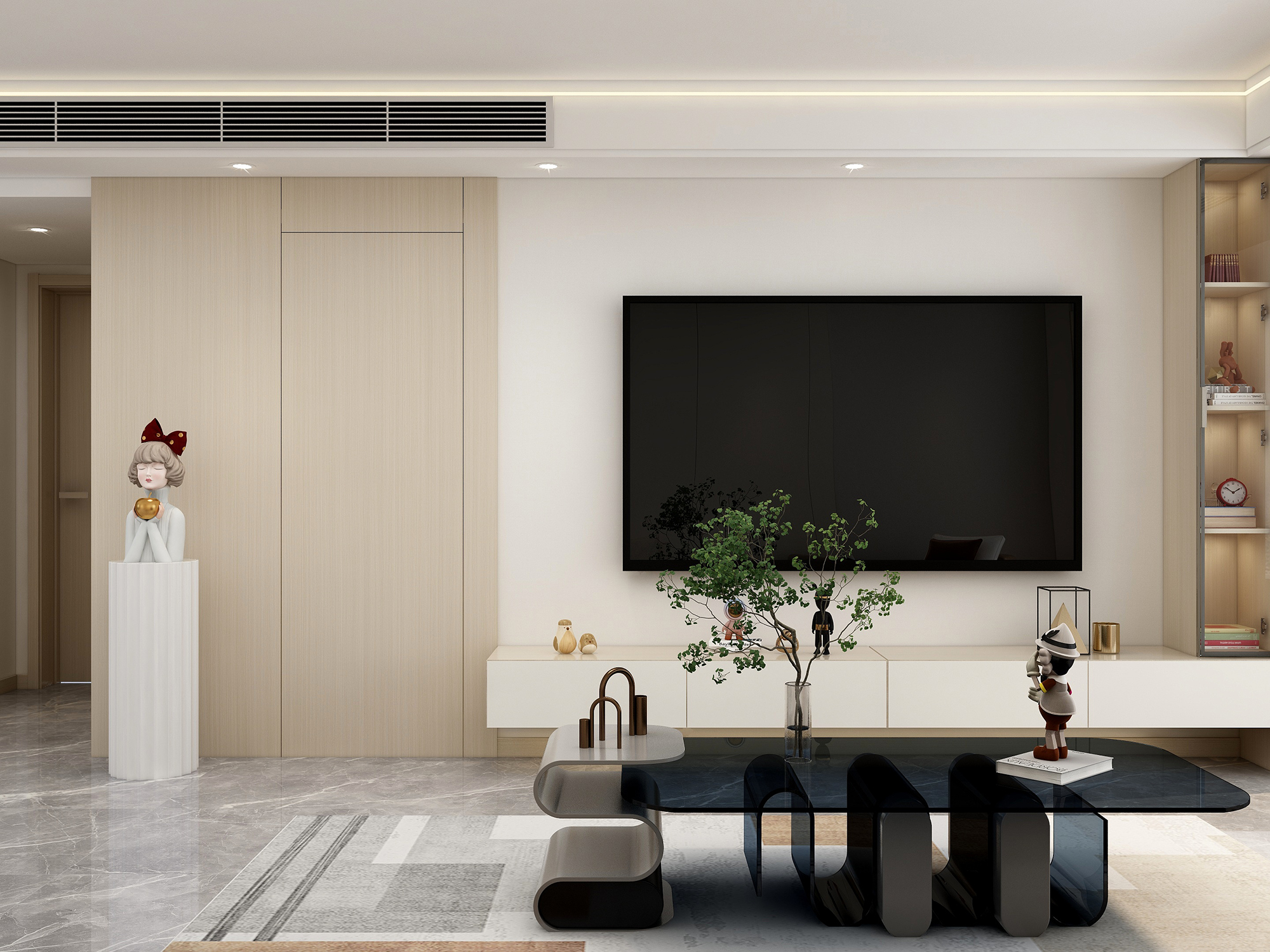 奶油白与原木色调的搭配,干净又温馨。悬空式电视柜搭配储物柜,增加整体层次感。