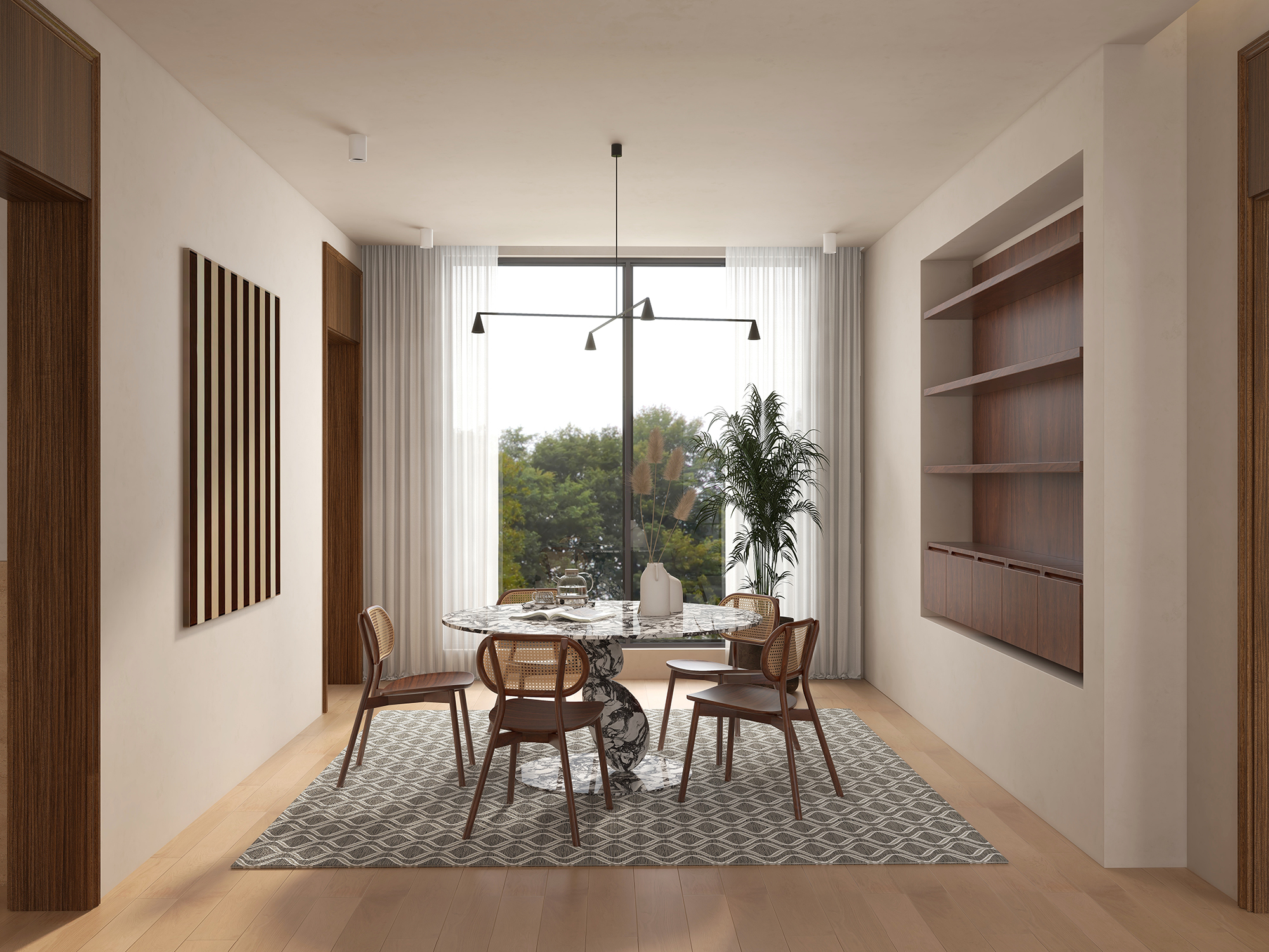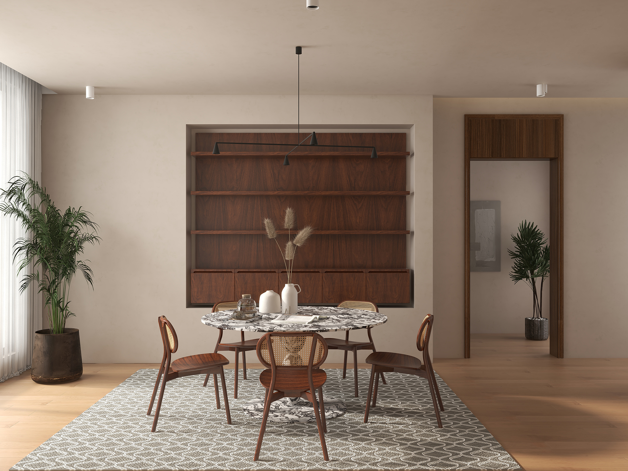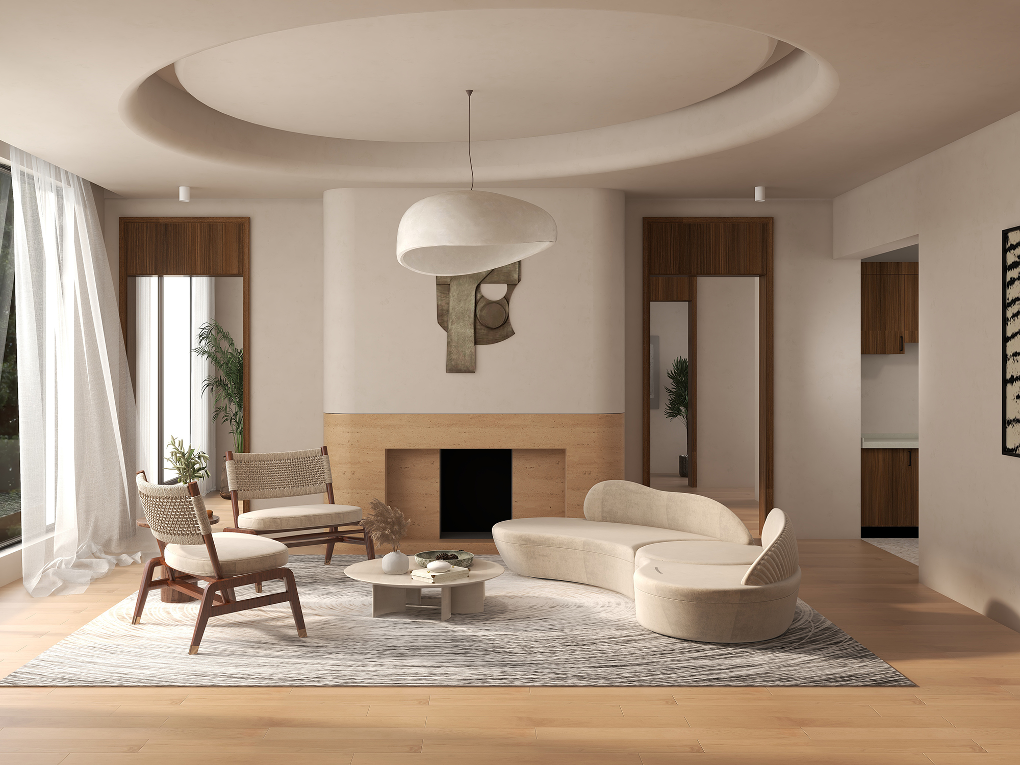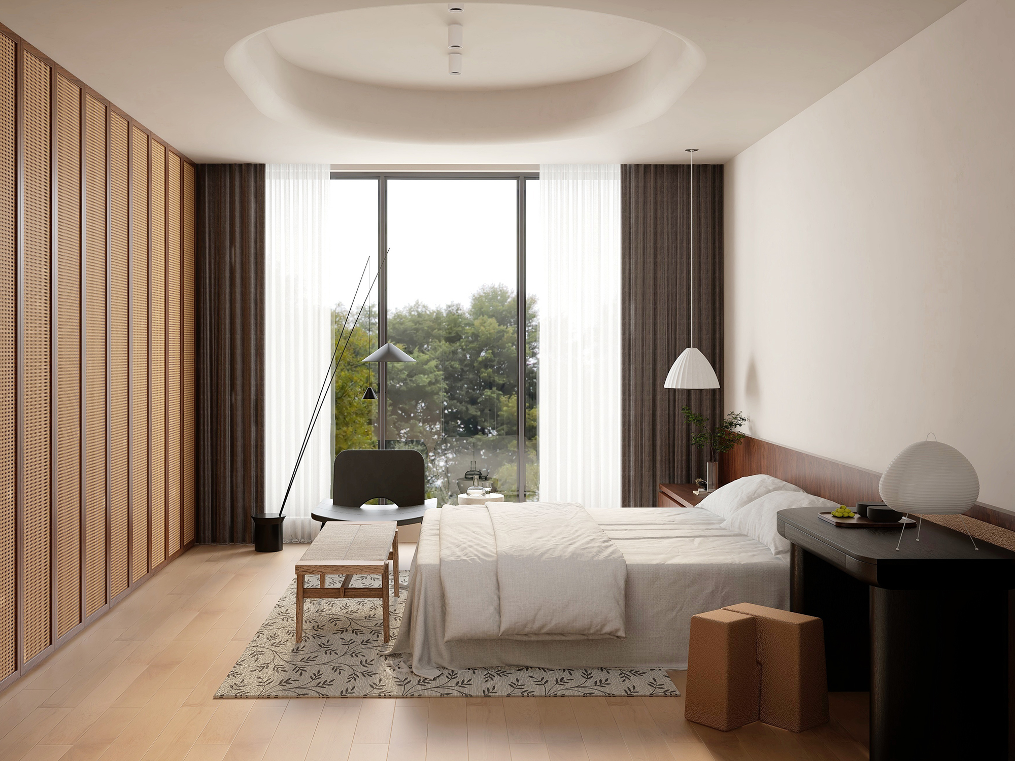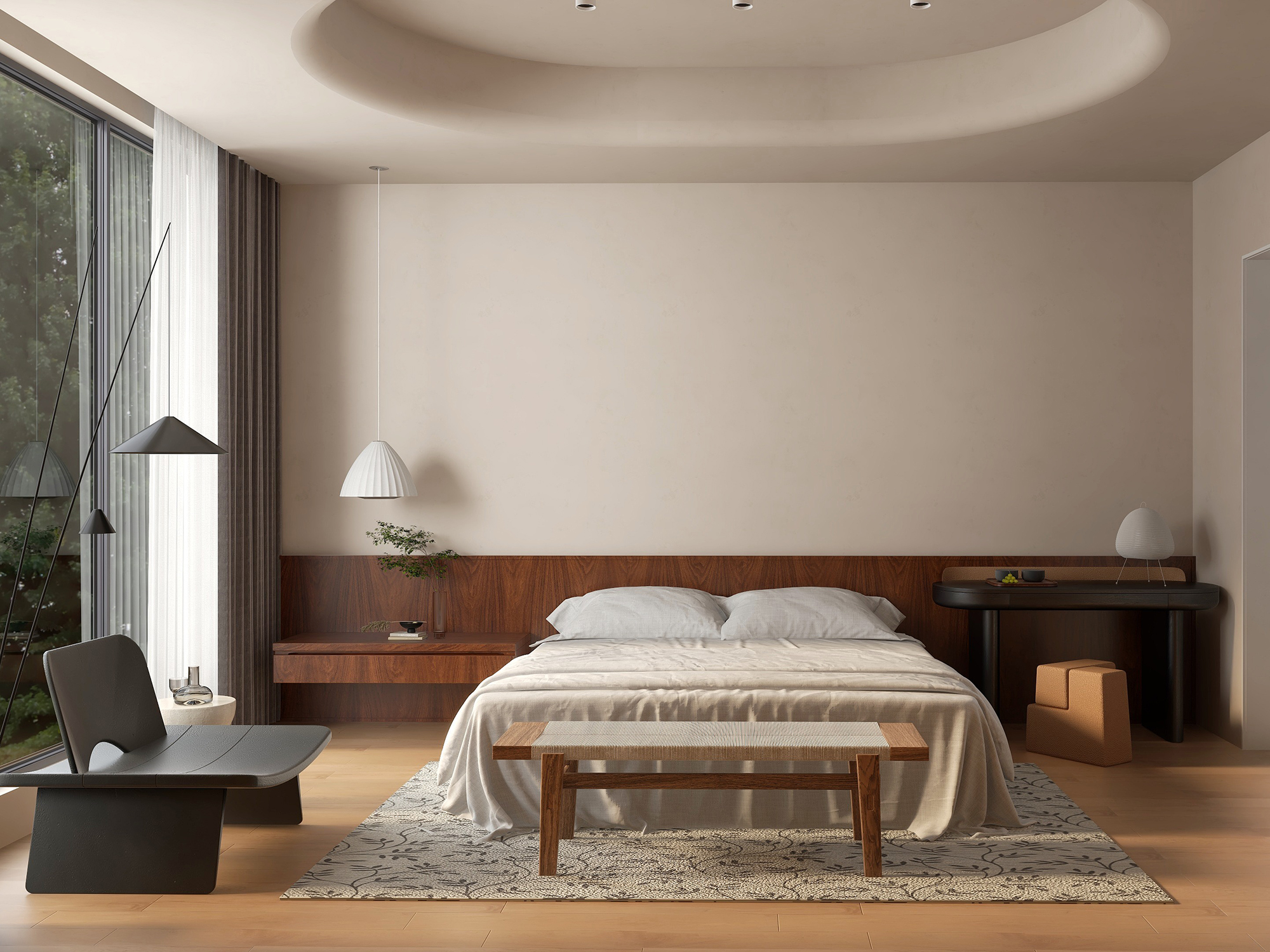 侘寂复古风强调自然材料和简约设计,营造出宁静、平和的氛围。同时,融合传统东方美学元素,如竹、木、石等,打造出具有历史感的空间。