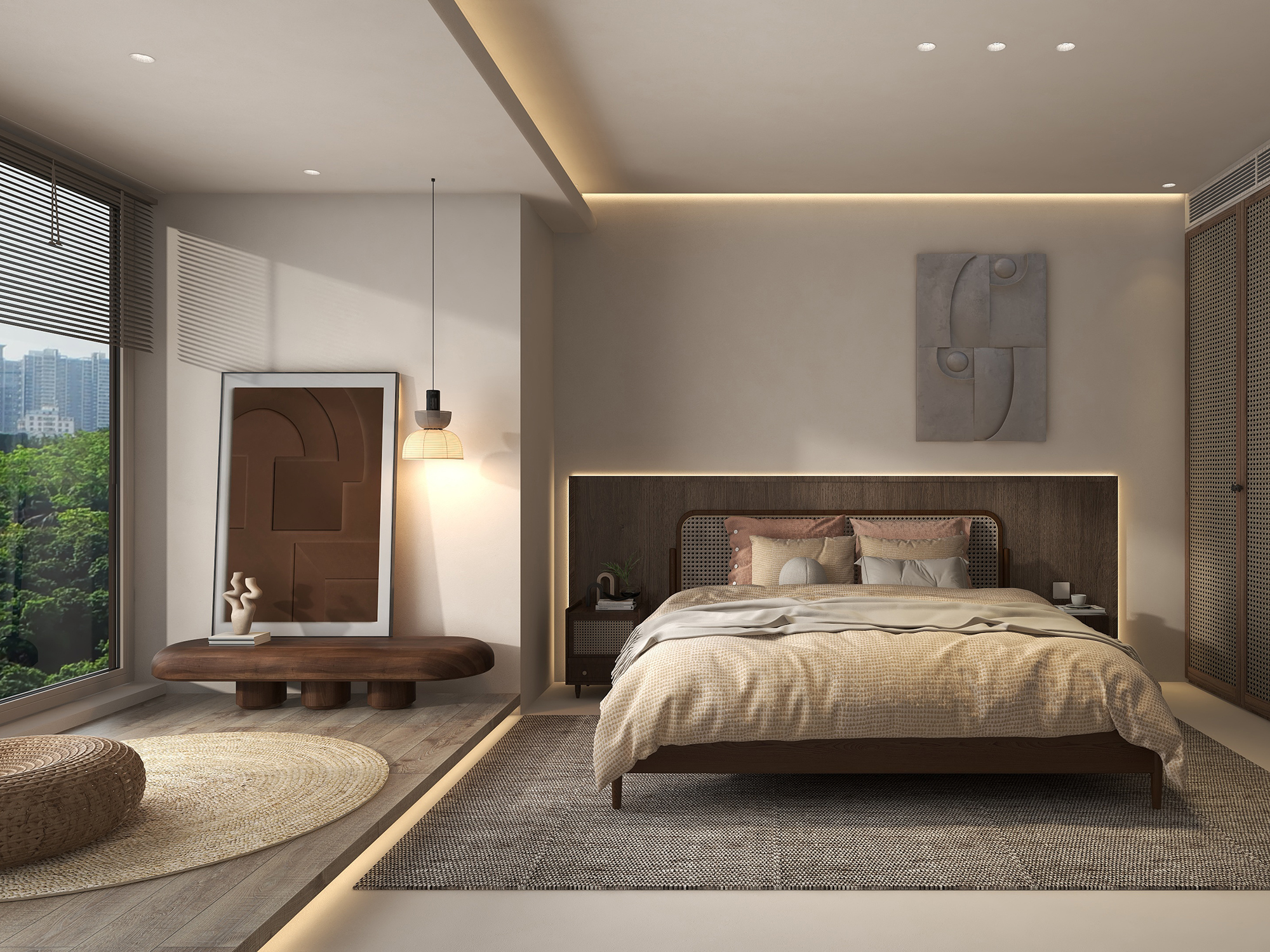 床头板向两侧延伸,与床头柜连为一体,自然形成半墙背景墙,周围嵌入灯带散发出暖意氛围。侧面做整墙到顶衣柜提升储物量,将镂空的藤编元素应用到柜门中去,再与木质边框相结合,给人一种通透的空气感,营造出休闲轻松的慢节奏生活。