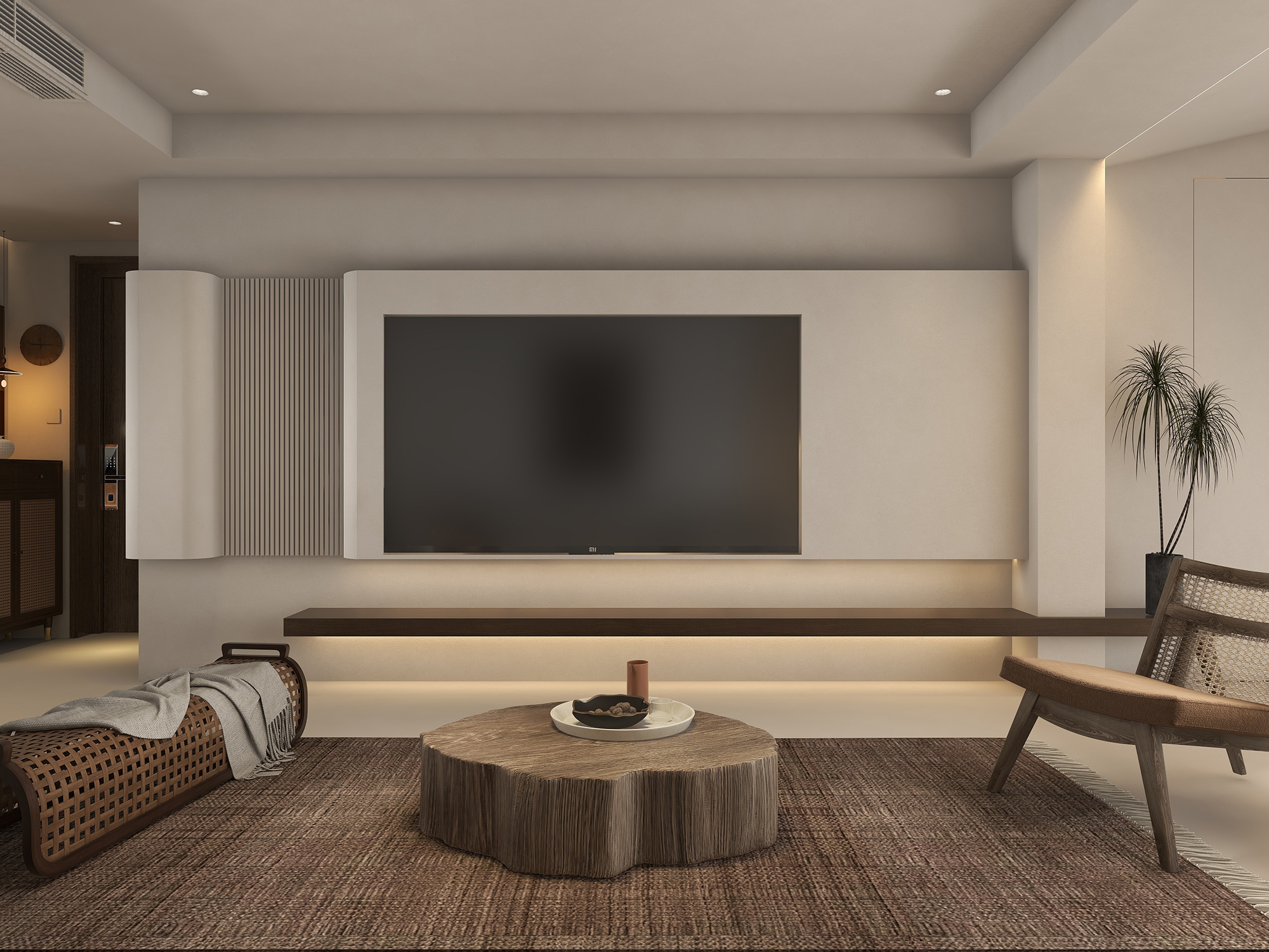 客厅使用墙顶地一体的奶油色,整体性统一,氛围感突出,还有着很好的包裹感。悬空的电视背景墙搭配圆角处理,轻便有型,极具层次感、下方的一字板置物架充当电视柜使用,简单耐看,也不容易藏污纳垢。