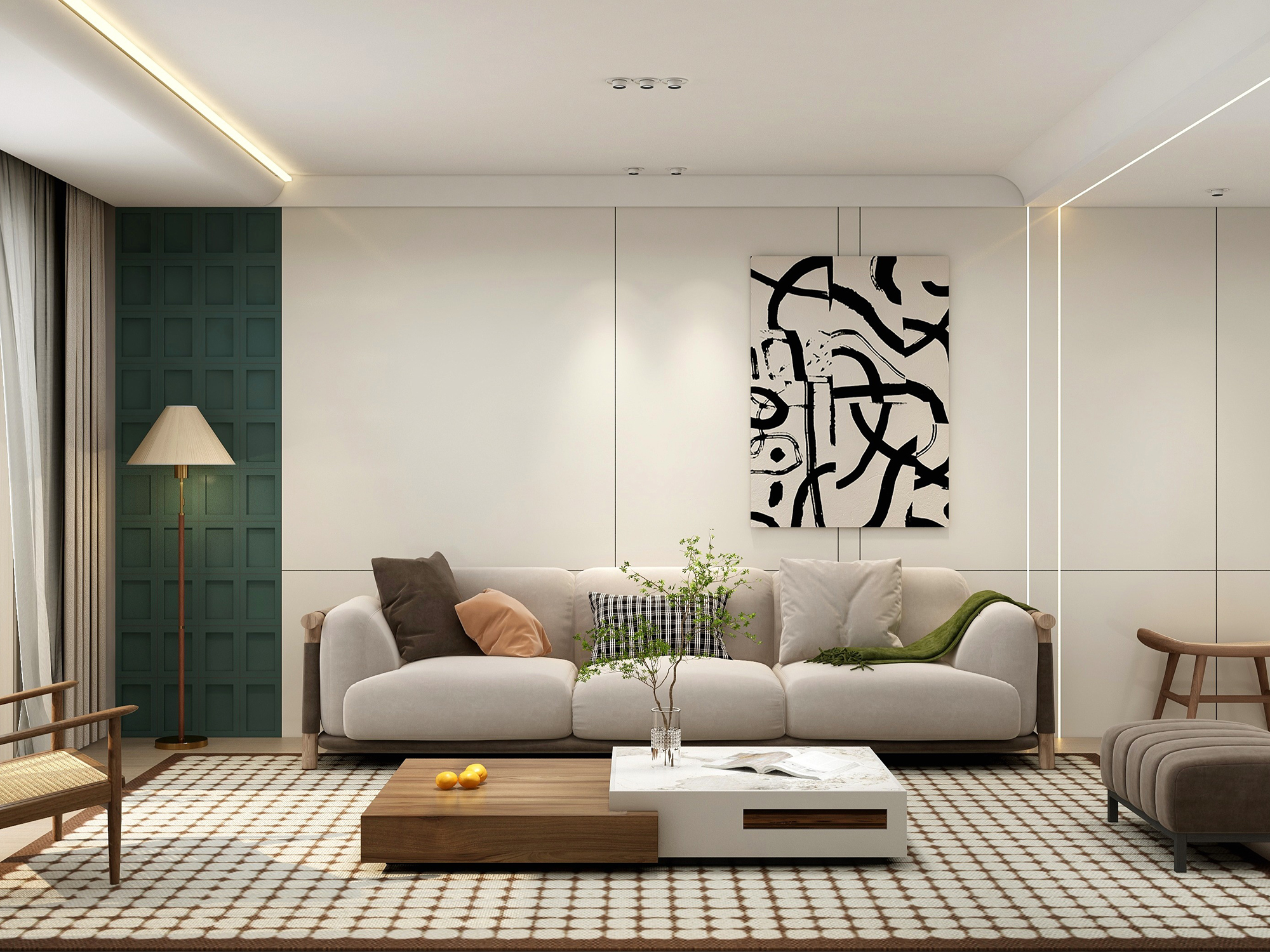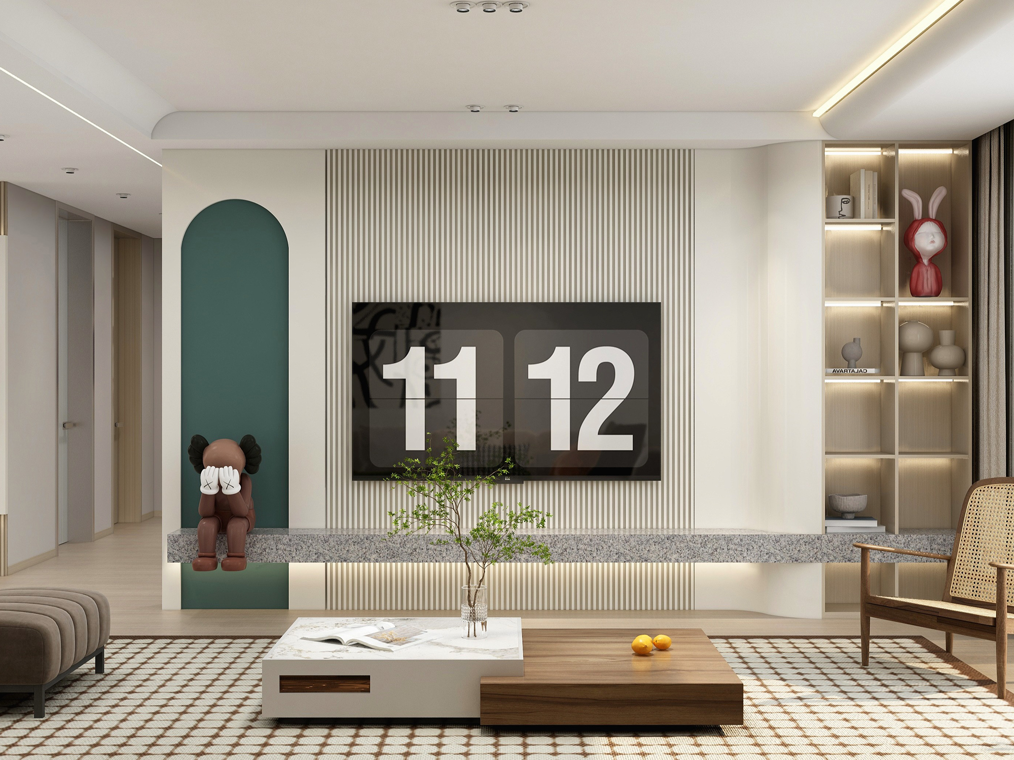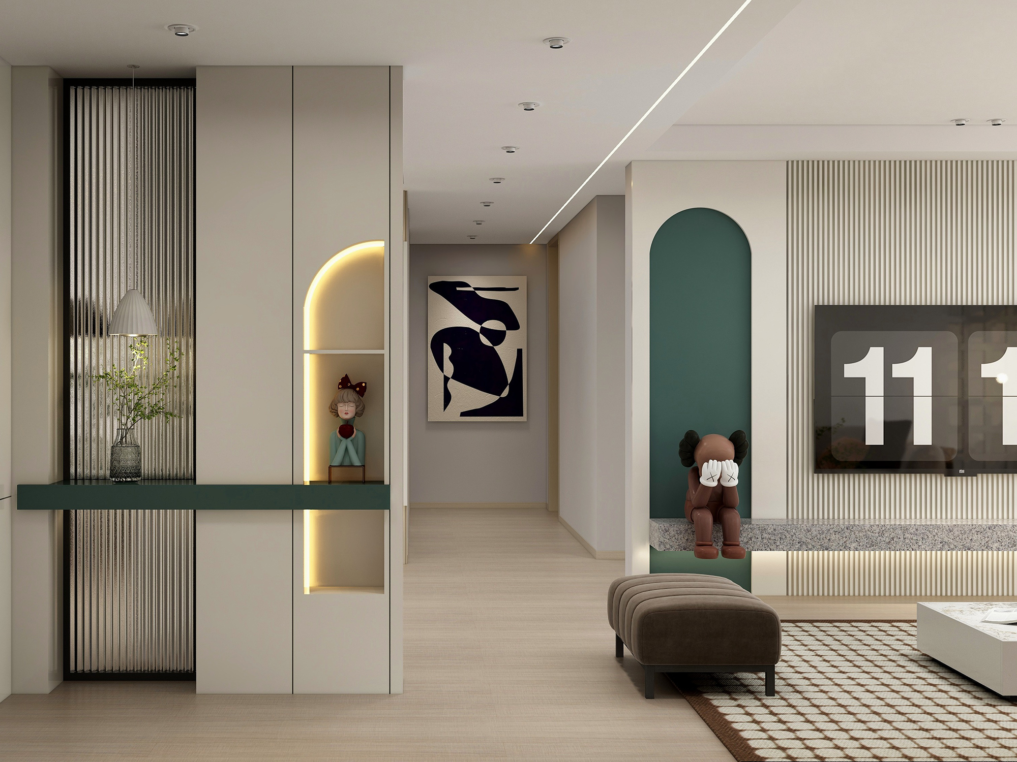 电视背景墙采用木饰面板和格栅板的拼接手法,突显主体位置的同时,也让层次更加分明。背景墙上的撞色设计也是一大亮点,远黛绿的拱门造型搭配潮玩摆件,带来一种年轻可爱的趣味艺术感。转角处做了流畅的弧形处理,顺势延伸至开放格柜,缓解了大体量柜体的冷硬感。沙发背景墙悄悄凹出“华夫格”造型,相应的运用远黛绿色,复古感满分!矮脚式的沙发椅凳、茶几边几,在端坐时放低人的视野高度,心情也随之会放松和柔软。