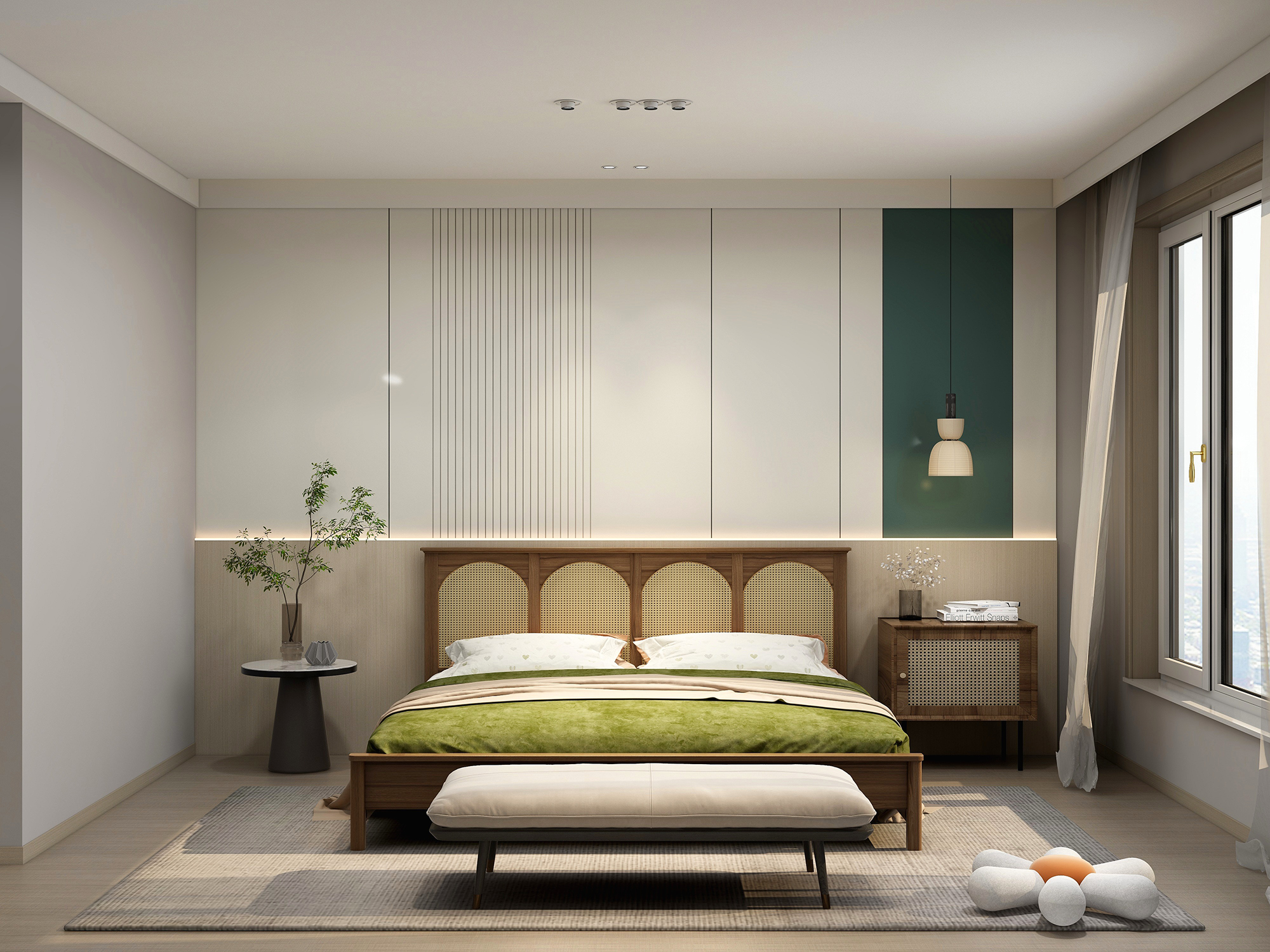 一张暖色藤编床、一角绿意马醉木、一抹复古远黛绿,足以拿捏住主卧自然高级的氛围感。铺上绒面地毯,摆上床尾软包条凳,给卧室装点上不一样的浪漫。