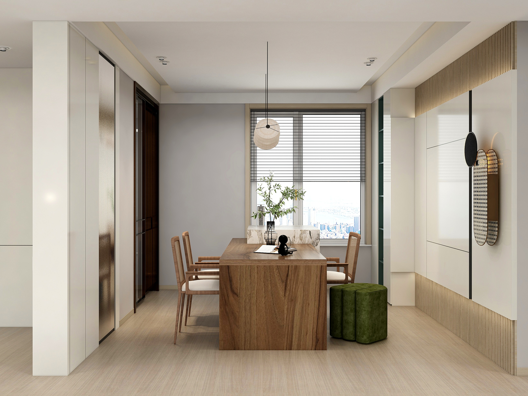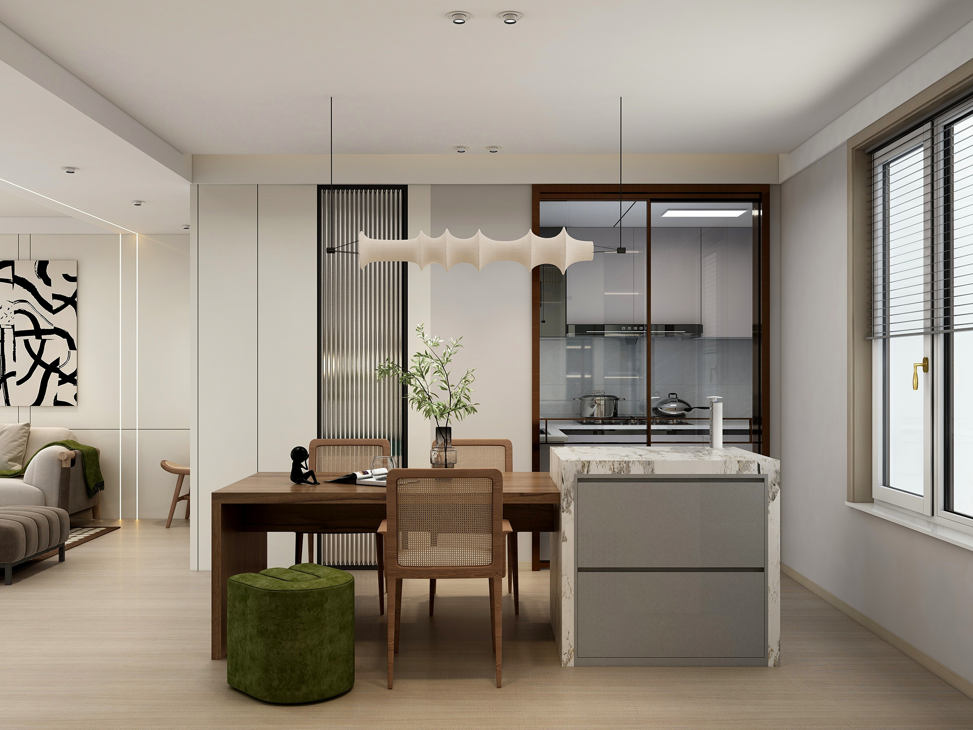 餐厅做多功能岛台,台面预埋升降式插座,既可以用作水吧台、备餐台,结合上木质长桌,还便于用餐和办公,功能性非常强大!