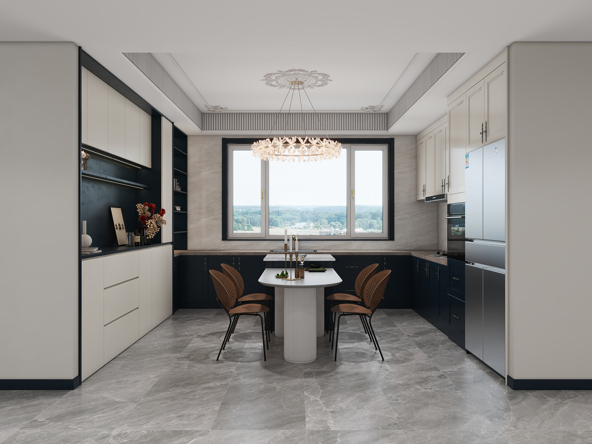餐厅与客厅相连,在法式简约风格下展现出优雅与实用并存。白色餐桌上摆放着精致的烛台,还没用餐已经感受到吃饭时的仪式感了。而一侧锦上宅门窗的运用,增强空间采光度的同时,使整个餐厅更加安静,让用餐时刻更加愉悦。